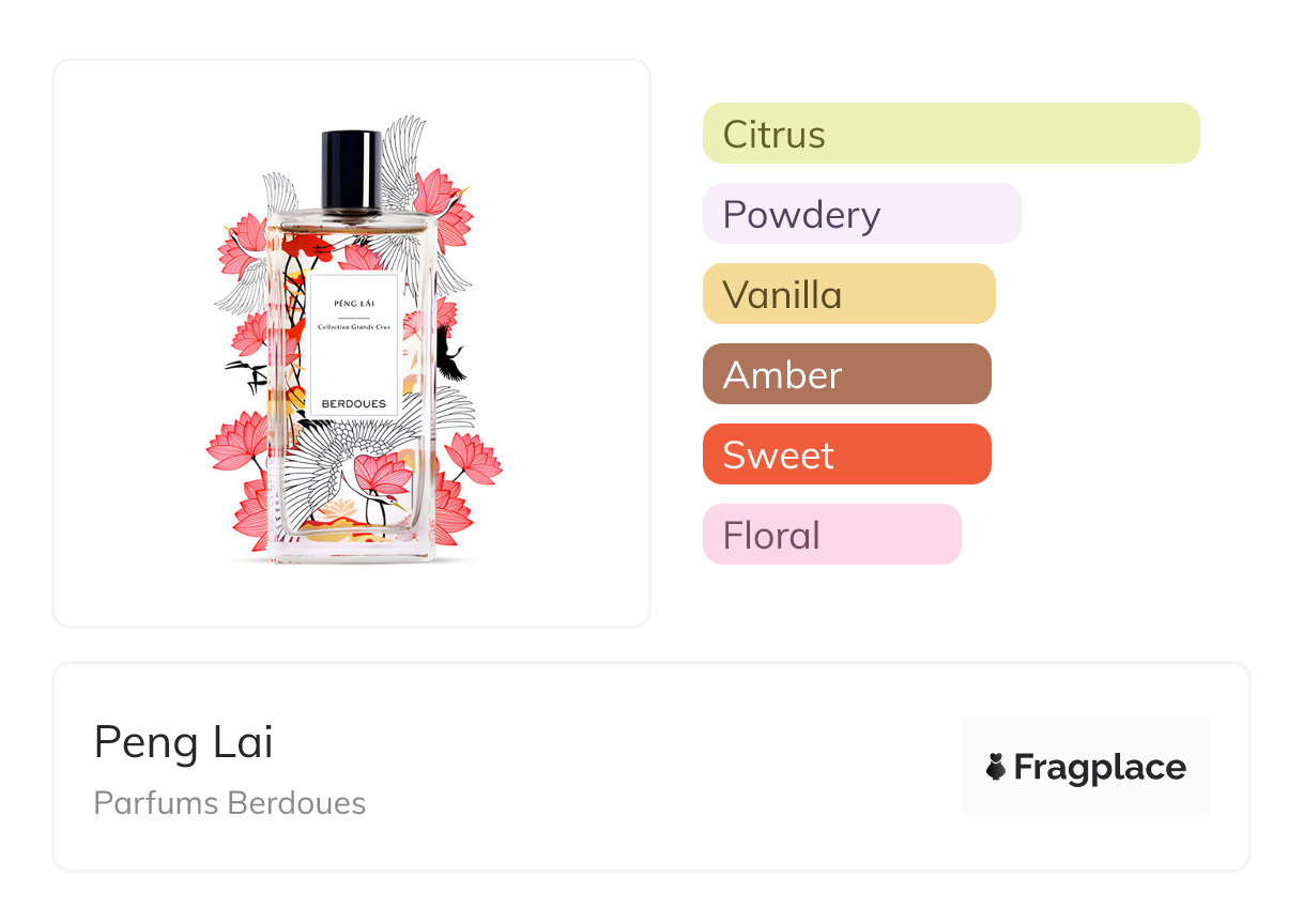 Peng Lai، من Parfums Berdoues تم إطلاقه في 2018. خبير العطور وراء هذا الإبداع هو غير معروف. يحتوي على النوتات العلوية من البرغموت, ليمون, برتقال يوسفي, and أوسمانثوس, النوتات الوسطى من البنزوين, زهر البرتقال, خوخ, and روز, and النوتات الأساسية من إيزو إي سوبر, المسك, تونكا بين, الفانيليا, and البنفسج.