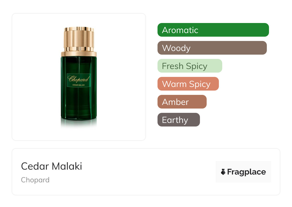 Cedar Malaki, von Chopard wurde im Jahr 2023 veröffentlicht. Der Parfümeur hinter dieser Kreation ist Alberto Morillas. Er hat die Kopfnoten von Artemisia, Kardamom, Zypresse, Grapefruit, and Lavendel, Herznoten von Zedernholz, and Basisnoten von Cypriolöl oder Nagarmotha, Labdanum, Patchouli, and Tonkabohne.