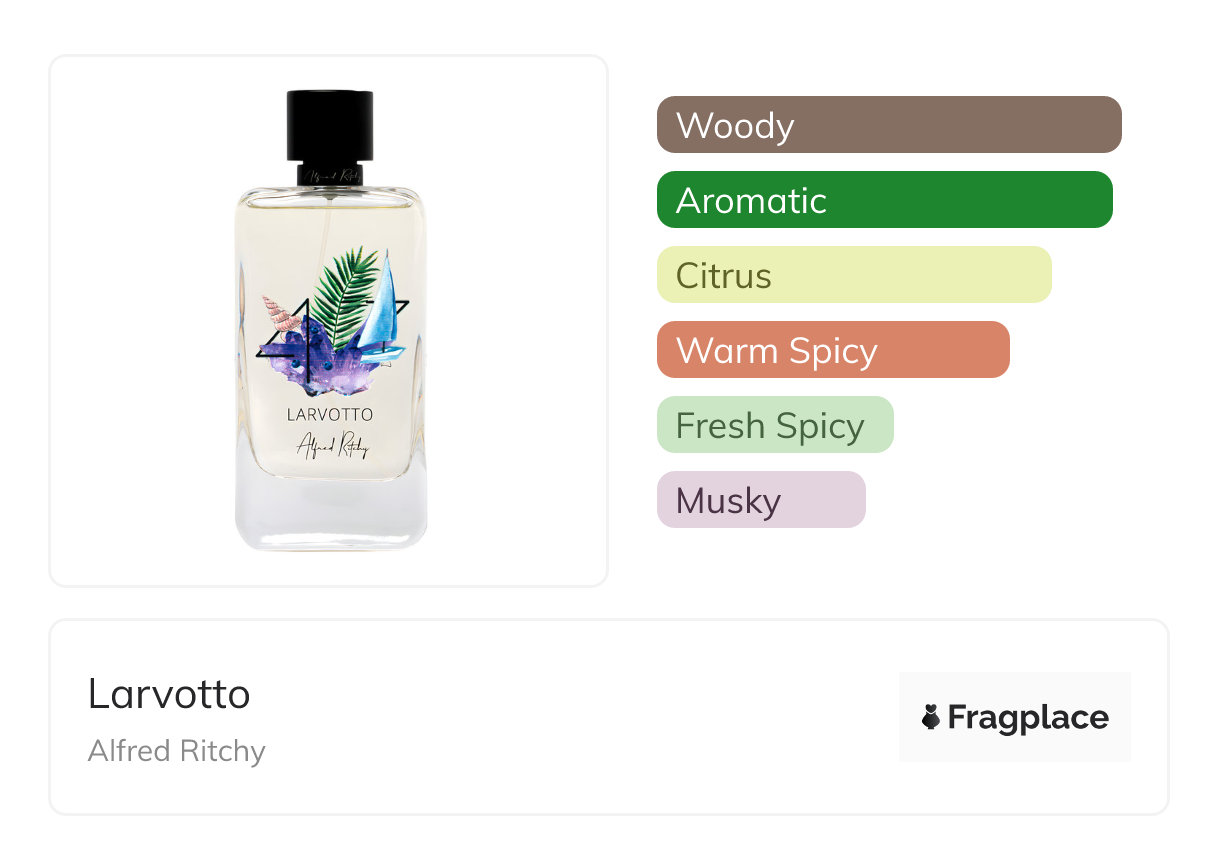 Larvotto, von Alfred Ritchy wurde im Jahr 2023 veröffentlicht. Der Parfümeur hinter dieser Kreation ist unbekannt. Er hat die Kopfnoten von Bergamotte, Schwarze Johannisbeere, and Mandarine-Orange, Herznoten von Kardamom, Zedernholz, and Thymian, and Basisnoten von Ambergris, Moschus, and Patchouli.