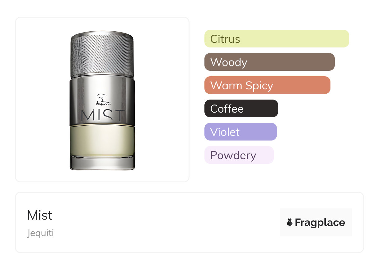 Mist, von Jequiti wurde im Jahr 2012 veröffentlicht. Der Parfümeur hinter dieser Kreation ist unbekannt. Er hat die Kopfnoten von Bergamotte and Mandarine-Orange, Herznoten von Kaffee and Violett, and Basisnoten von Zedernholz, Patchouli, and Tonkabohne.