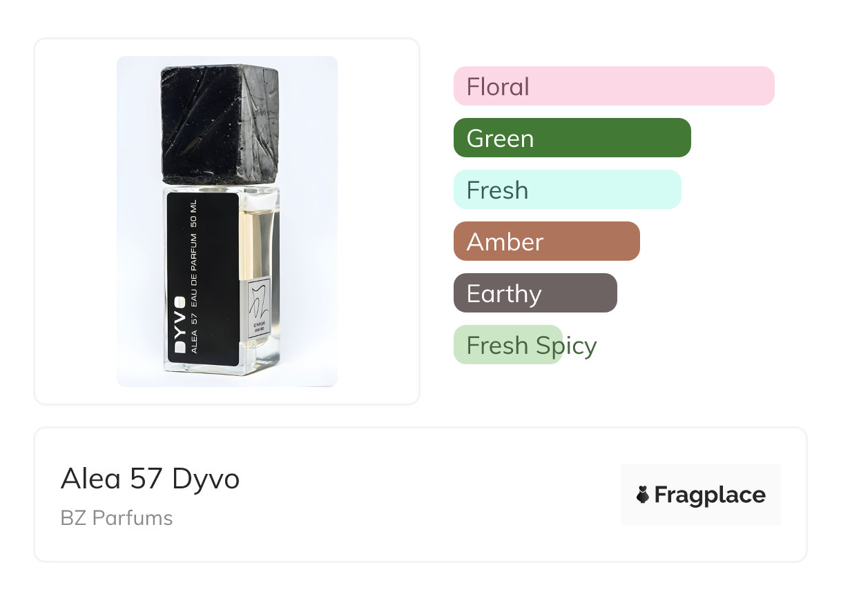 Alea 57 Dyvo, von BZ Parfums wurde im Jahr 2019 veröffentlicht. Der Parfümeur hinter dieser Kreation ist unbekannt. Die Noten sind Aprikosenblüte, Benzoe, Cyclamen, Erdige Noten, Gras, Hyazinthe, Lavendel, Flieder, Maiglöckchen, Moschus, Eichenmoos, Ozonische Noten, Harze, Tonkabohne.