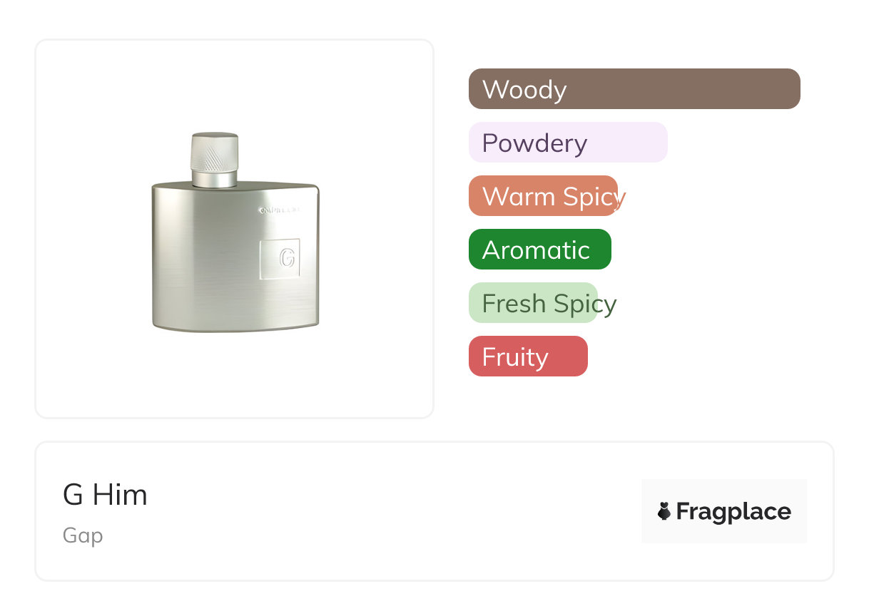 G Him, von Gap wurde im Jahr 2002 veröffentlicht. Der Parfümeur hinter dieser Kreation ist unbekannt. Er hat die Kopfnoten von Baumwollblüte, Melone, and Granatapfel, Herznoten von Kardamom and Wacholder, and Basisnoten von Bernstein, Moschus, Sandelholz, and Holzige Noten.