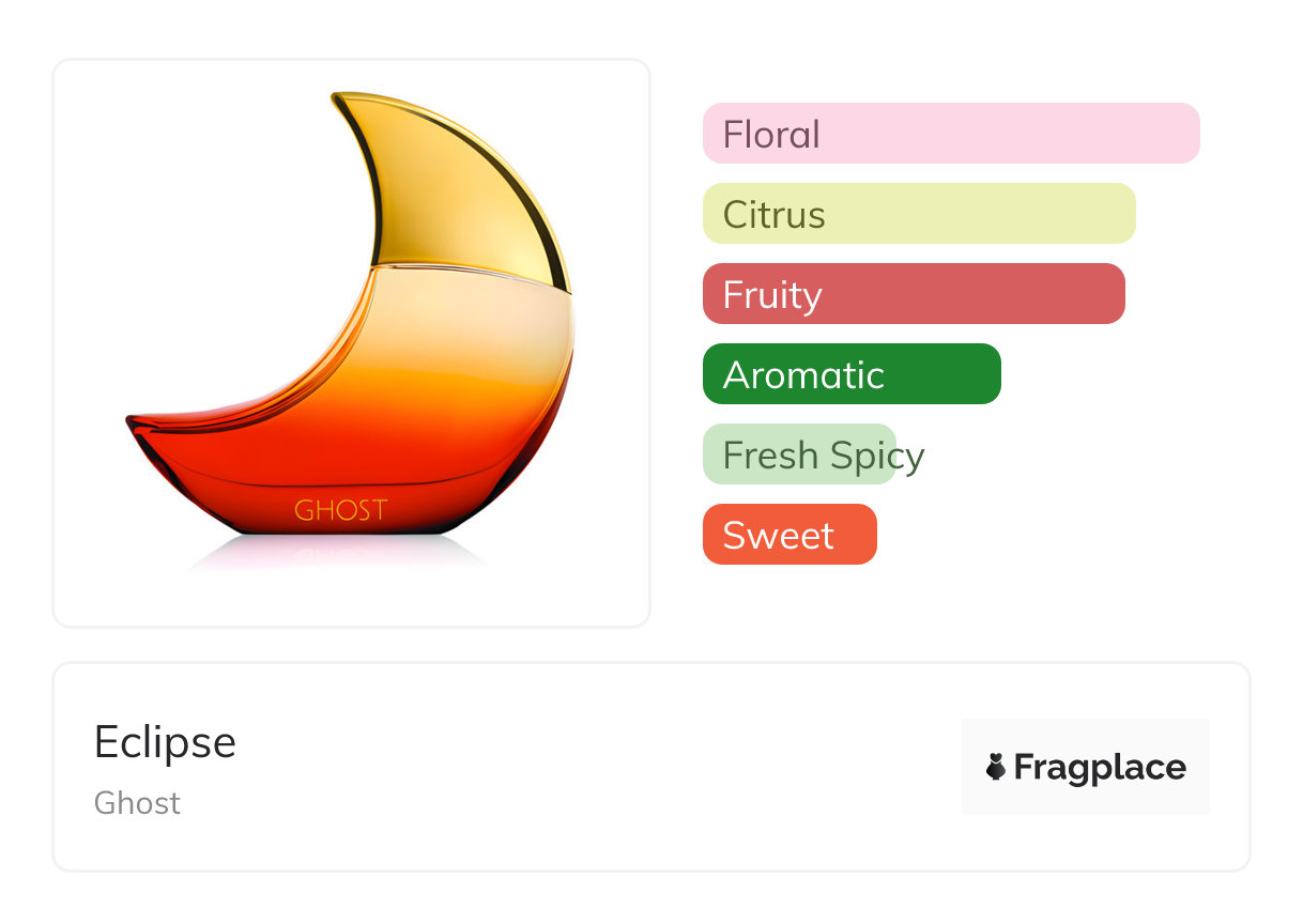 Eclipse, von Ghost wurde im Jahr 2014 veröffentlicht. Der Parfümeur hinter dieser Kreation ist unbekannt. Er hat die Kopfnoten von Apfel, Bergamotte, Schwarze Johannisbeere, Englische Ringelblume, Zitrone, Mandarine-Orange, and Pfirsich, Herznoten von Freesie, Lotus, and Rose, and Basisnoten von Bernstein and Moschus.