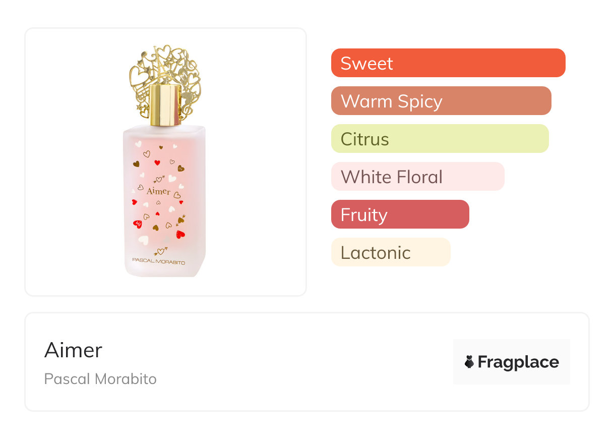 Aimer, von Pascal Morabito wurde in unbekanntem Jahr veröffentlicht. Der Parfümeur hinter dieser Kreation ist unbekannt. Er hat die Kopfnoten von Ingwer, Himbeere, and Mandarine, Herznoten von Gardenie, Neroli, and Rose, and Basisnoten von Benzoe, Dulce de Leche, and Sandelholz.