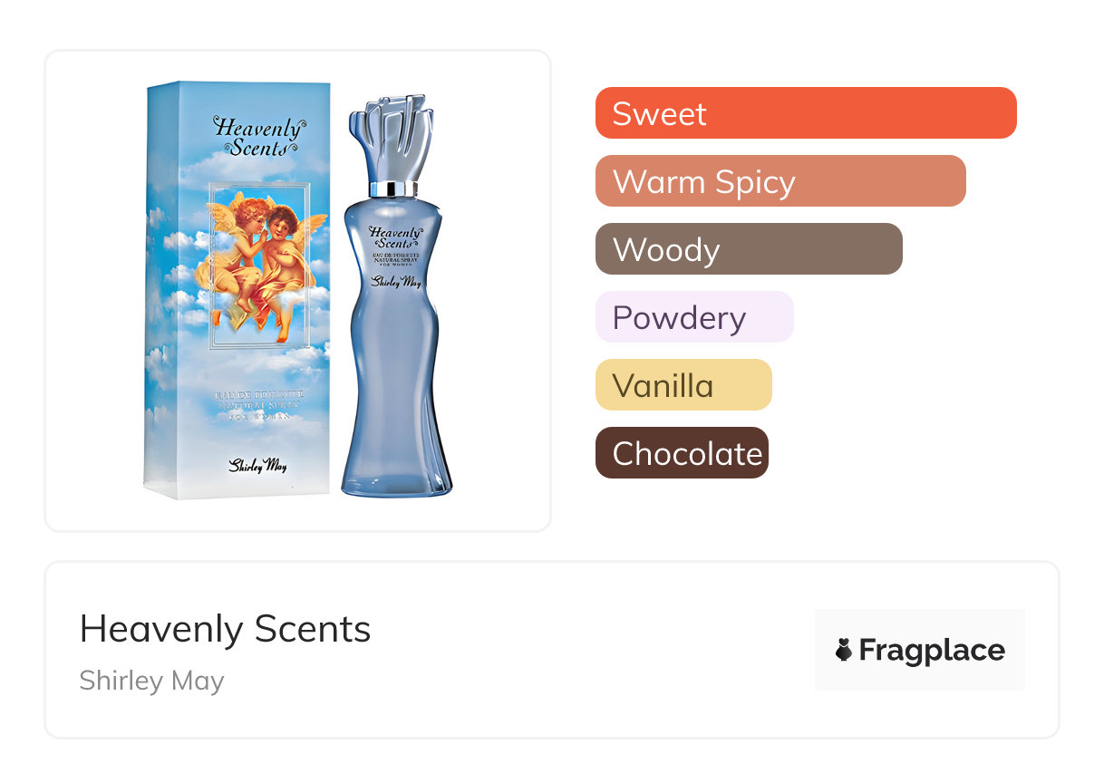 Heavenly Scents, von Shirley May wurde im Jahr 2015 veröffentlicht. Der Parfümeur hinter dieser Kreation ist unbekannt. Er hat die Kopfnoten von Zartbitterschokolade and Honig, Herznoten von Karamell and Vanille, and Basisnoten von Patchouli and Sandelholz.