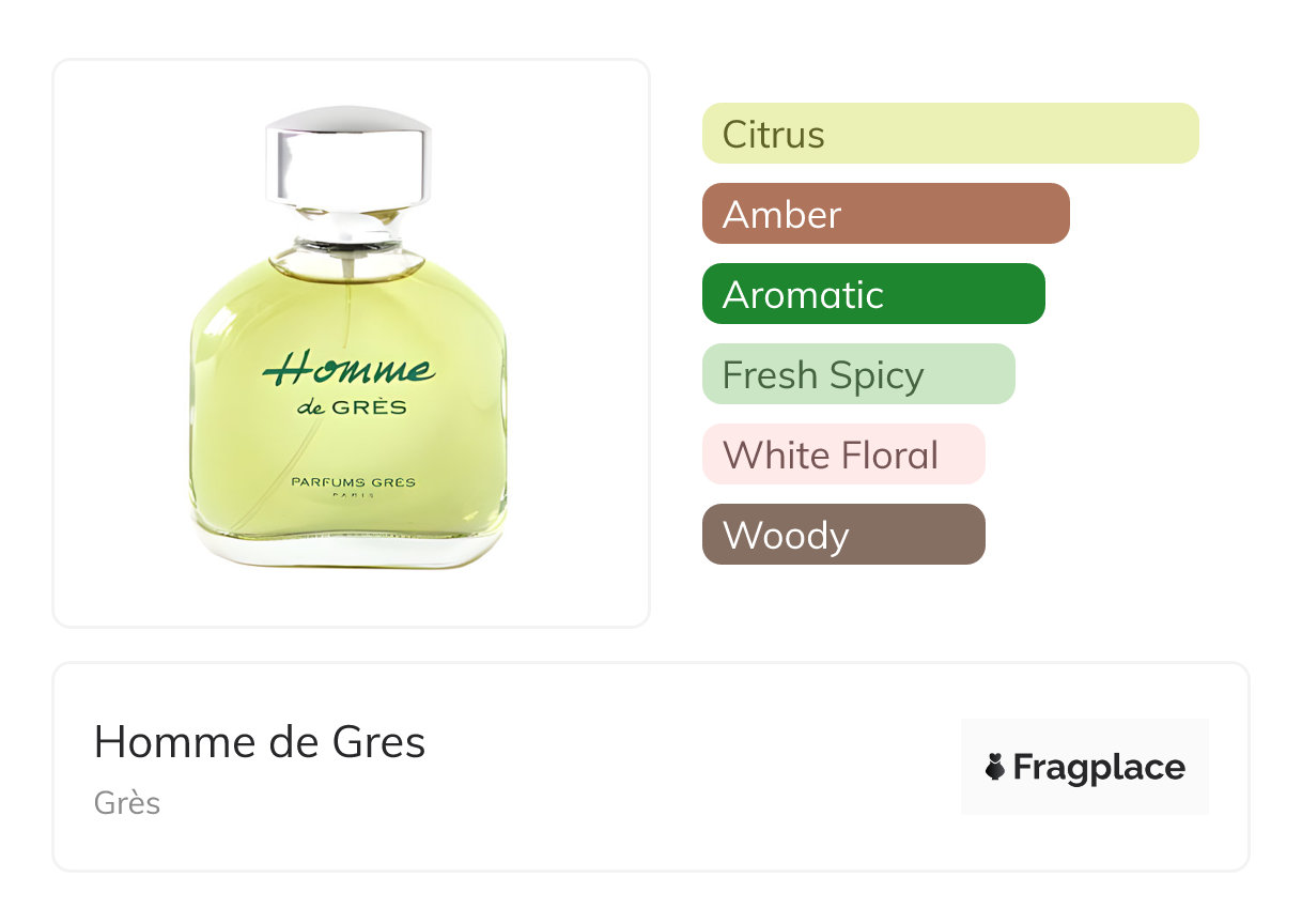 Homme de Gres, von Grès wurde im Jahr 1996 veröffentlicht. Der Parfümeur hinter dieser Kreation ist Gerard Anthony. Er hat die Kopfnoten von Basilikum, Bergamotte, Zitrone, and Petitgrain, Herznoten von Benzoe, Jasmin, Labdanum, Neroli, and Pfirsich, and Basisnoten von Bernstein, Moschus, Eichenmoos, and Sandelholz.