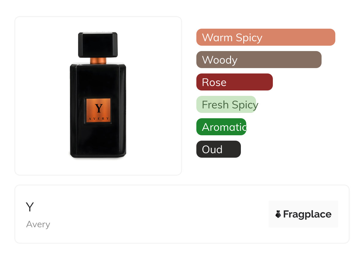 Y, from Avery was released in 2017. The perfumer behind this creation is Celso Fadelli. It has the top notes of Coffee and Saffron, middle notes of Geranium, Lily-of-the-Valley, and Rose, and base notes of Agarwood (Oud), Cedarwood, Guaiac Wood, Myrrh, and Sandalwood.
