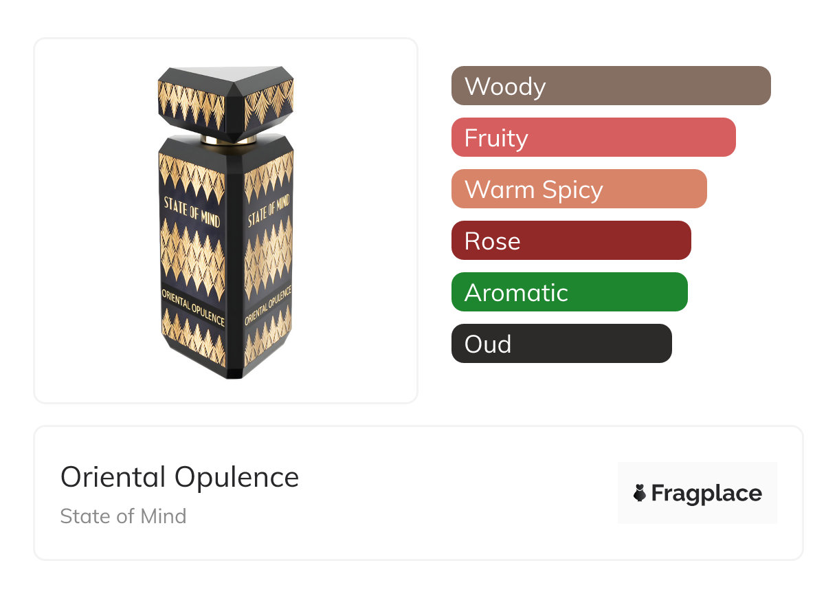 Oriental Opulence, von State of Mind wurde im Jahr 2024 veröffentlicht. Der Parfümeur hinter dieser Kreation ist Karine Dubreuil-Sereni. Die Noten sind Agarholz (Oud), Akigalawood, Bernstein, Bergamotte, Moltebeere, Nard, Patchouli, Feigenkaktus, Rose, Safran, Taif-Rose, Tee, Vetiver.