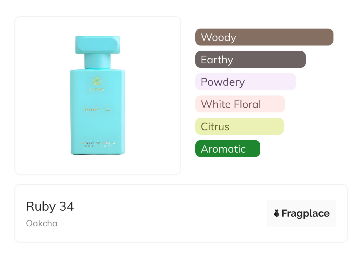 Ruby 34, von Oakcha wurde in unbekanntem Jahr veröffentlicht. Der Parfümeur hinter dieser Kreation ist unbekannt. Er hat die Kopfnoten von Bergamotte, Zitrone, Neroli, and Ylang-Ylang, Herznoten von Iris, Jasmin, Maiglöckchen, Orriswurzel, and Rose, and Basisnoten von Bernstein, Moschus, Eichenmoos, Patchouli, Sandelholz, Vanille, and Vetiver.