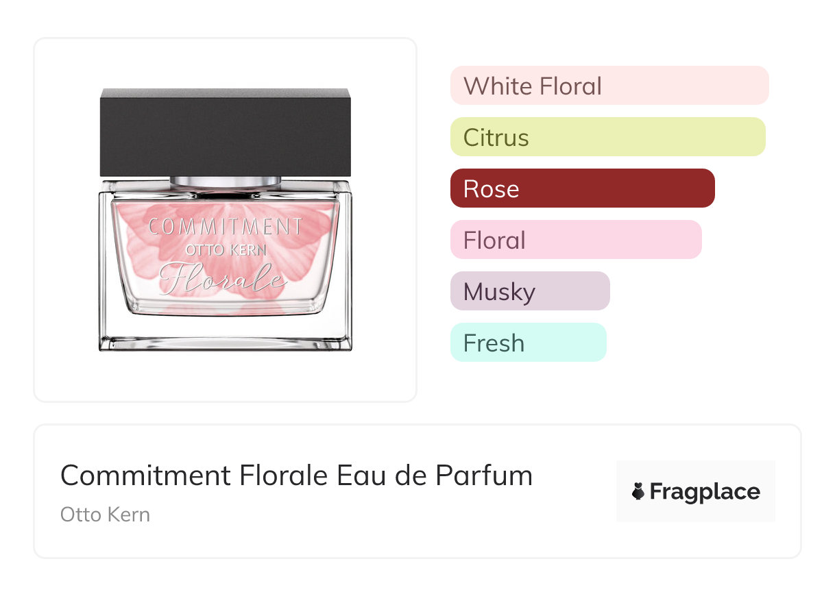 Commitment Florale Eau de Parfum, von Otto Kern wurde im Jahr 2020 veröffentlicht. Der Parfümeur hinter dieser Kreation ist unbekannt. Er hat die Kopfnoten von Zitrone, Lily, and Orange, Herznoten von Jasmin, Pfingstrose, and Rose, and Basisnoten von Bernstein, Zedernholz, and Moschus.