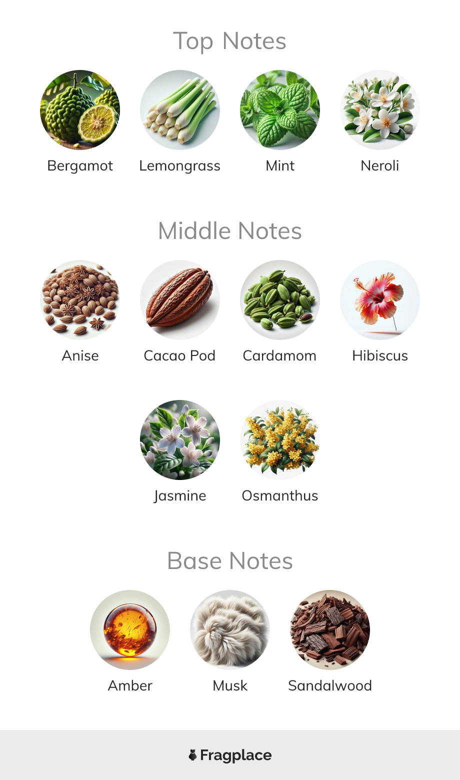 Samoa, von Womo wurde in unbekanntem Jahr veröffentlicht. Der Parfümeur hinter dieser Kreation ist unbekannt. Er hat die Kopfnoten von Bergamotte, Zitronengras, Minze, and Neroli, Herznoten von Anis, Kakaoschote, Kardamom, Hibiskus, Jasmin, and Osmanthus, and Basisnoten von Bernstein, Moschus, and Sandelholz.