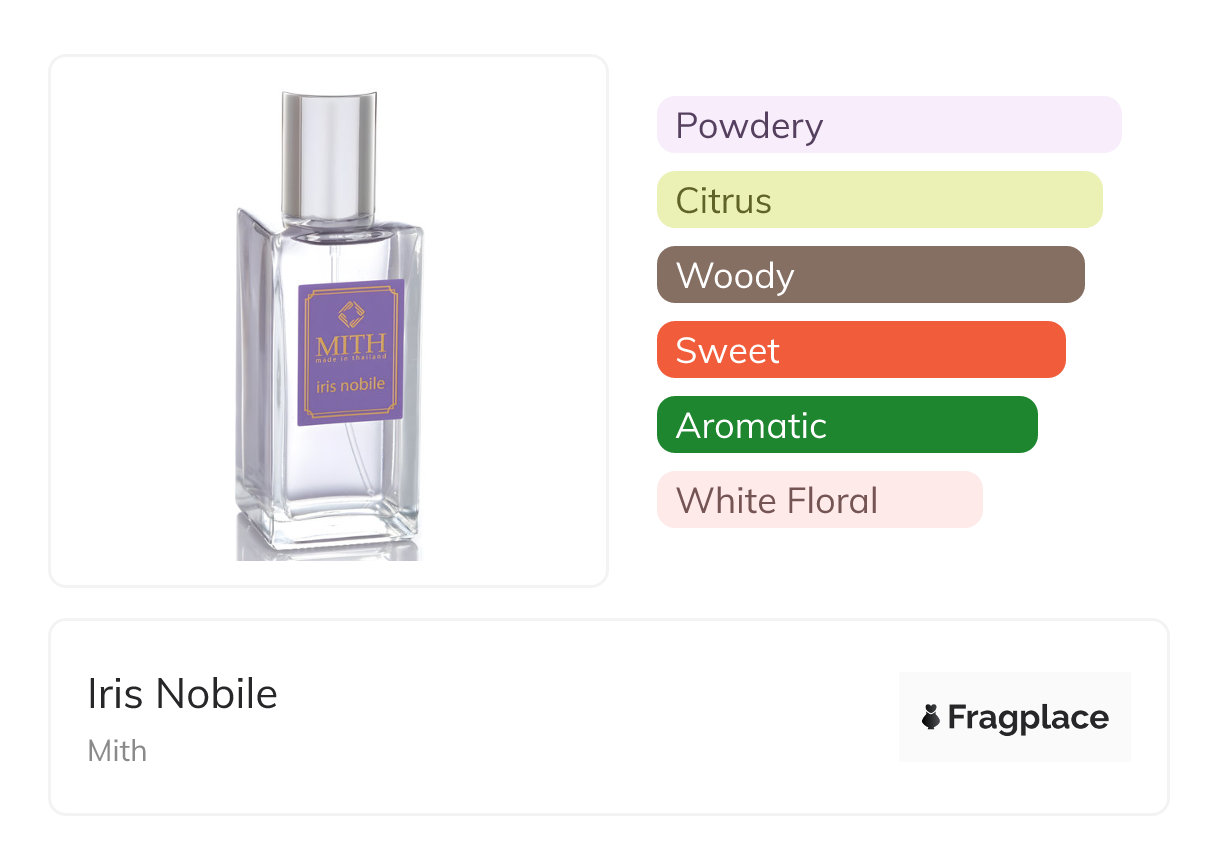 Iris Nobile, von Mith wurde in unbekanntem Jahr veröffentlicht. Der Parfümeur hinter dieser Kreation ist unbekannt. Er hat die Kopfnoten von Bergamotte, Zitrone, Himbeere, and Rote Beeren, Herznoten von Iris, Jasmin, Orangenblüte, Rose, and Violett, and Basisnoten von Moschus, Harze, Sandelholz, Tonkabohne, and Vetiver.