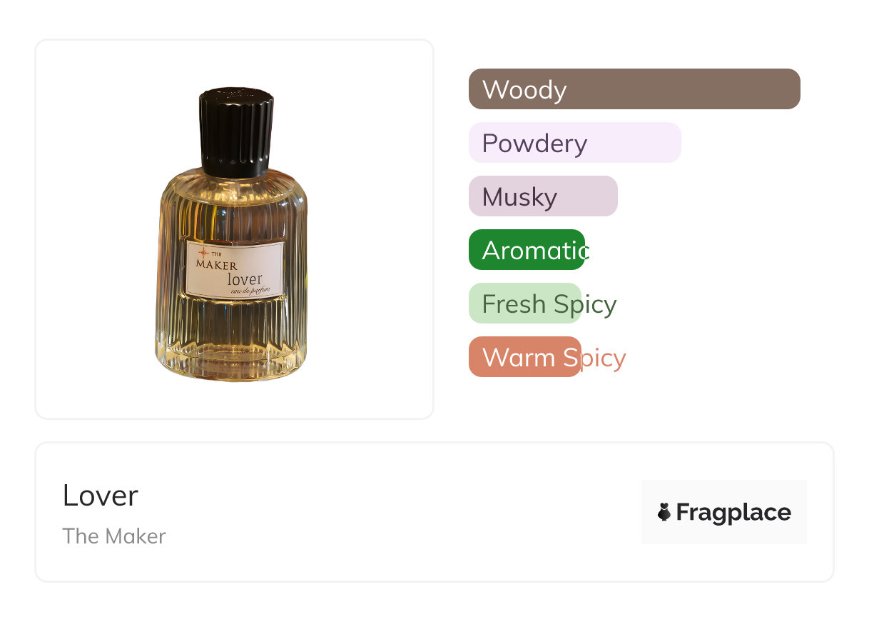 Lover, von The Maker wurde im Jahr 2023 veröffentlicht. Der Parfümeur hinter dieser Kreation ist unbekannt. Er hat die Kopfnoten von Abbildung, Pfeffer, and Vanille, Herznoten von Zedernholz, Jasmin, Narzisse, and Wildleder, and Basisnoten von Agarholz (Oud), Moschus, Sandelholz, and Vetiver.