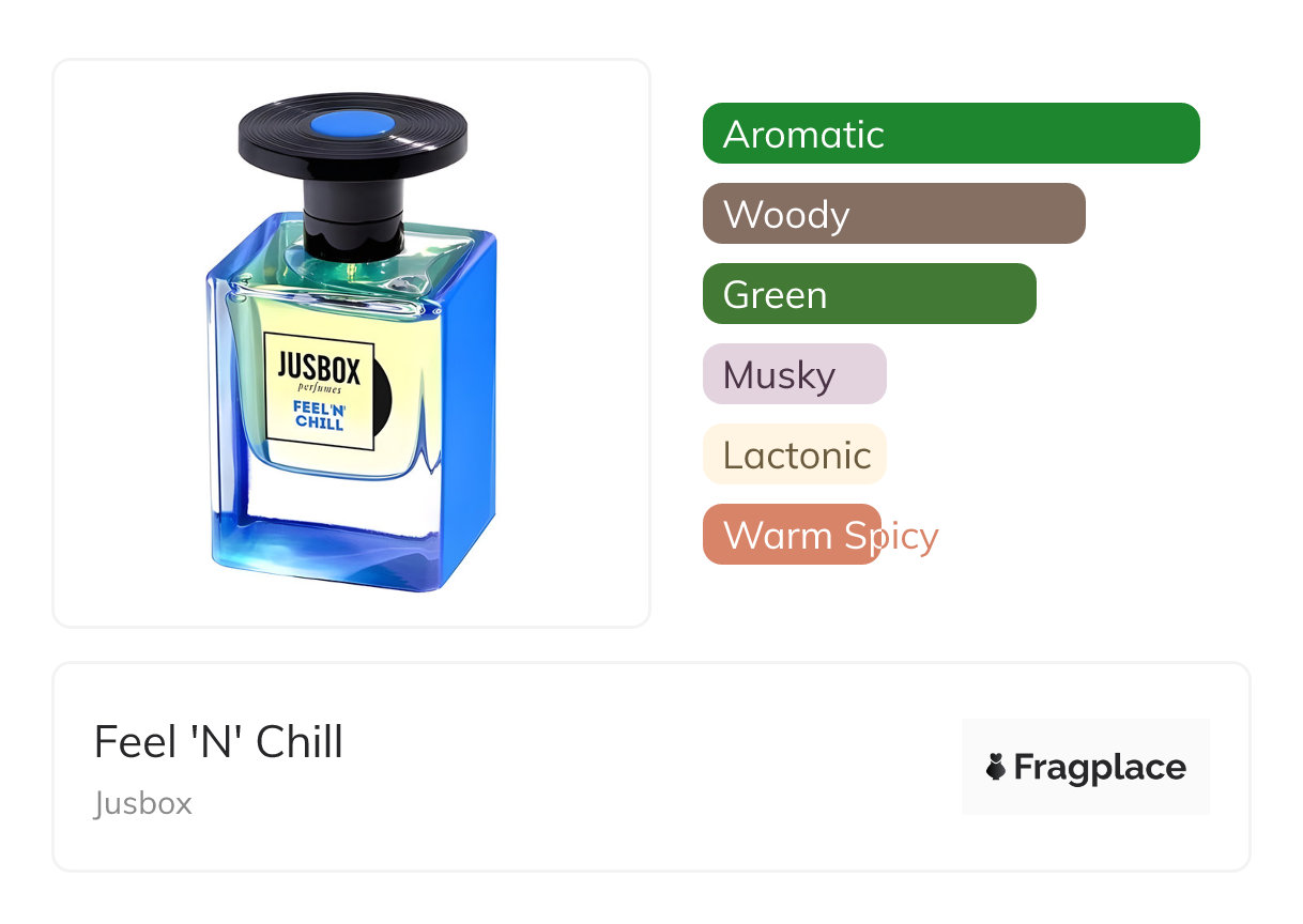 Feel 'N' Chill, von Jusbox wurde im Jahr 2017 veröffentlicht. Der Parfümeur hinter dieser Kreation ist Dominique Ropion. Er hat die Kopfnoten von Bergamotte, Kardamom, and Wassermelone, Herznoten von Kokosnuss, Feigenblatt, and Tannenbaum, and Basisnoten von Bernstein, Moschus, and Vetiver.