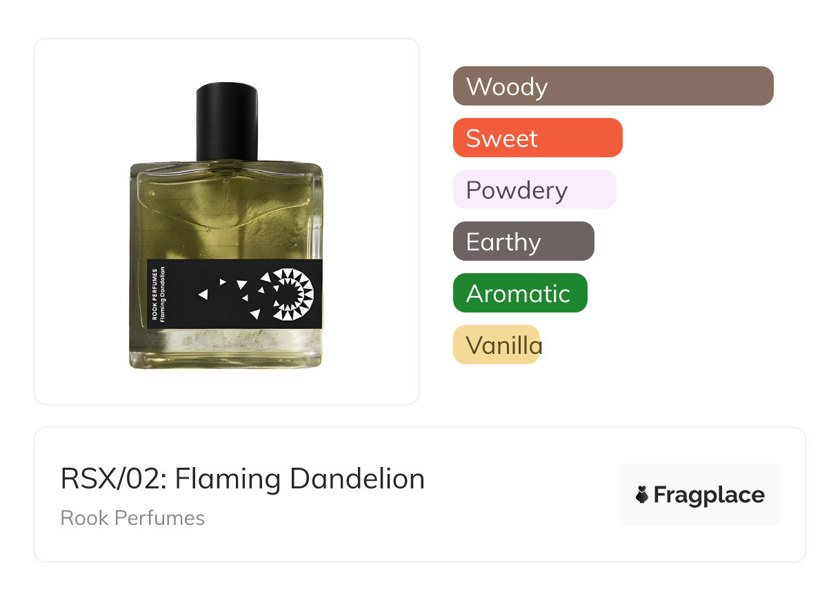 RSX/02: Flaming Dandelion, von Rook Perfumes wurde im Jahr 2020 veröffentlicht. Der Parfümeur hinter dieser Kreation ist unbekannt. Er hat die Kopfnoten von Rauch, Teakholz, and Ylang-Ylang, Herznoten von Marshmallow, Pudrige Noten, and Vanille, and Basisnoten von Bernstein, Amyris, Eichenmoos, and Vetiver.