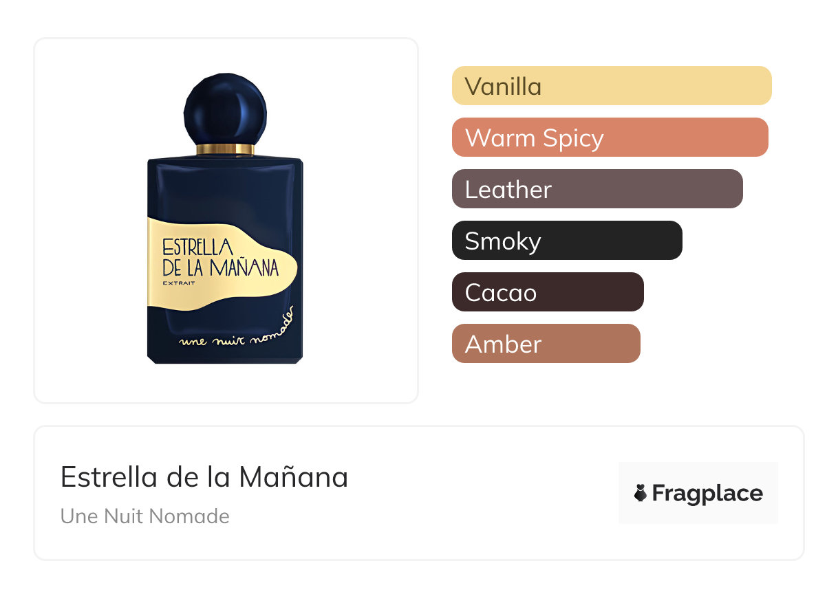 Estrella de la Mañana, von Une Nuit Nomade wurde im Jahr 2024 veröffentlicht. Der Parfümeur hinter dieser Kreation ist Jérôme Di Marino. Die Noten sind Benzoe, Birke, Kakaoschote, Vanille.