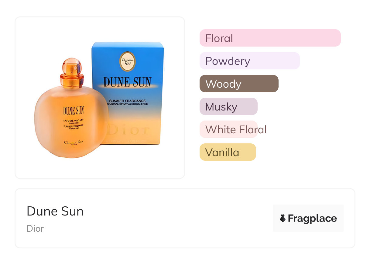 Dune Sun, von Dior wurde im Jahr 2003 veröffentlicht. Der Parfümeur hinter dieser Kreation ist unbekannt. Er hat die Kopfnoten von Schwarze Johannisbeere and Mandarine-Orange, Herznoten von Freesie, Jasmin, and Lotus, and Basisnoten von Moschus, Sandelholz, and Vanille.