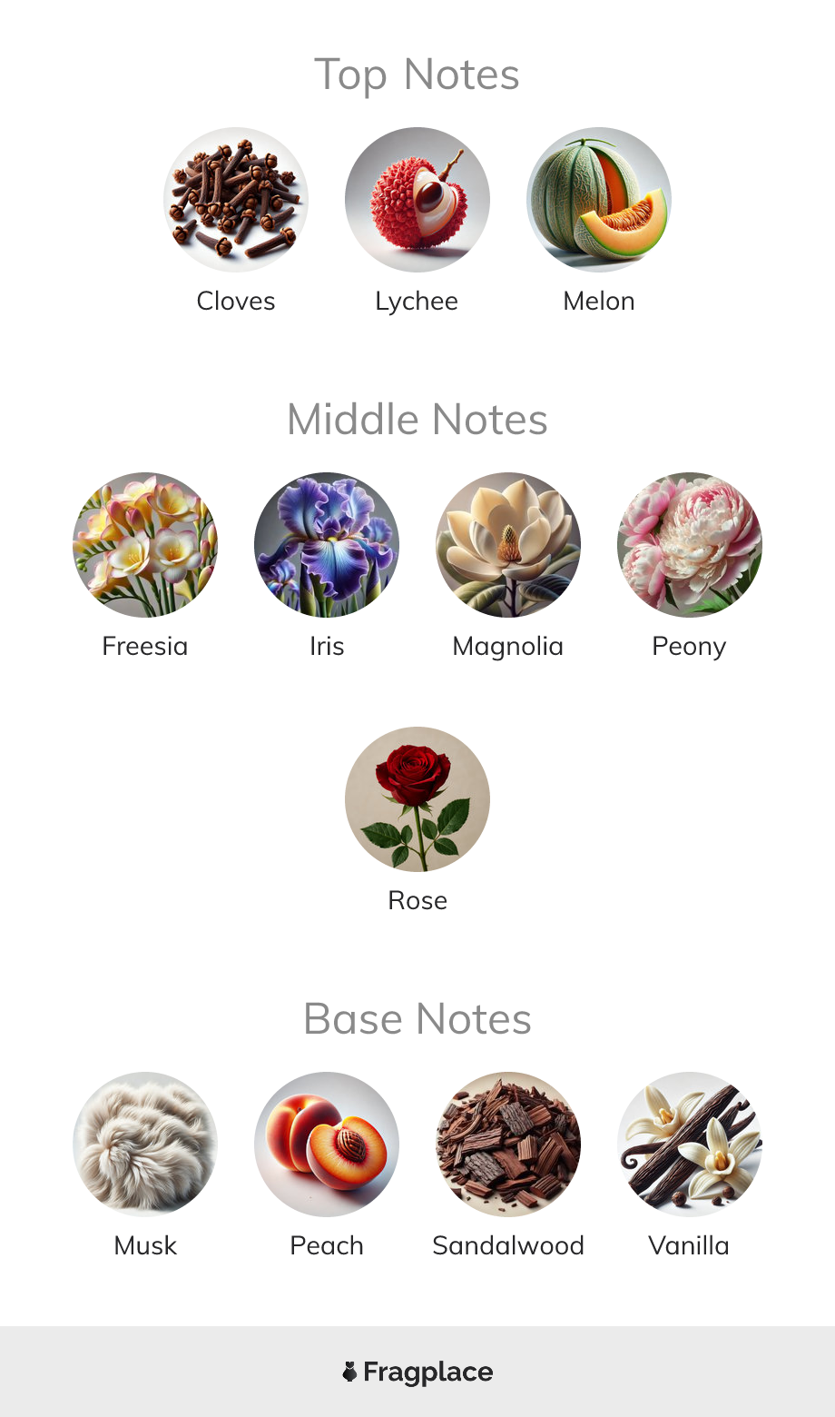 Irresistible Iris, from Judith Williams was released in 2016. The perfumer behind this creation is unknown. It has the top notes of Cloves, Lychee, and Melon, middle notes of Freesia, Iris, Magnolia, Peony, and Rose, and base notes of Musk, Peach, Sandalwood, and Vanilla.