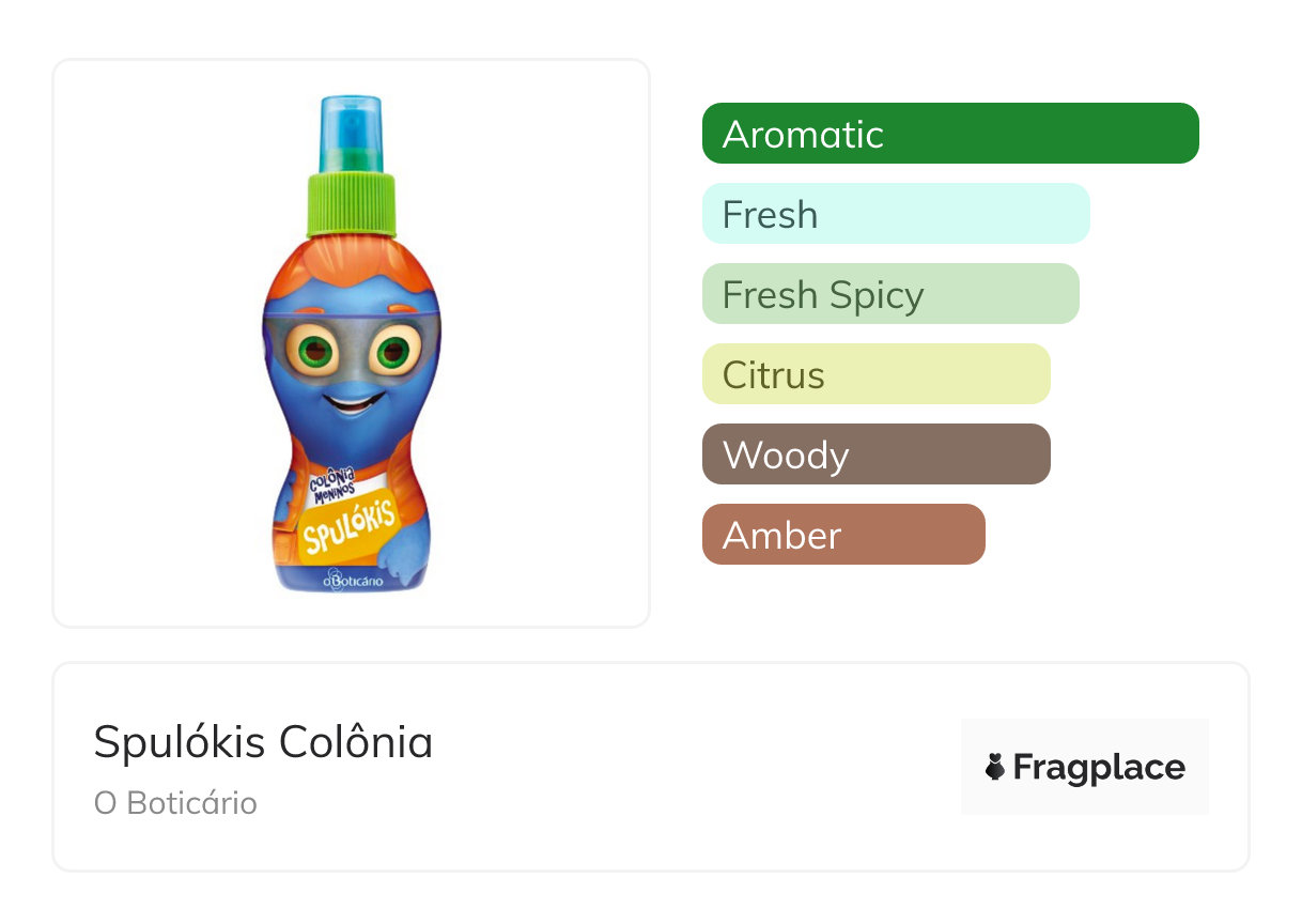 Spulókis Colônia, from O Boticário was released in 2012. The perfumer behind this creation is unknown. It has the top notes of Apple, Bergamot, Lemon, and Water, middle notes of Cedarwood, Geranium, Lavender, and Lily-of-the-Valley, and base notes of Amber, Musk, Sandalwood, and Tonka Bean.