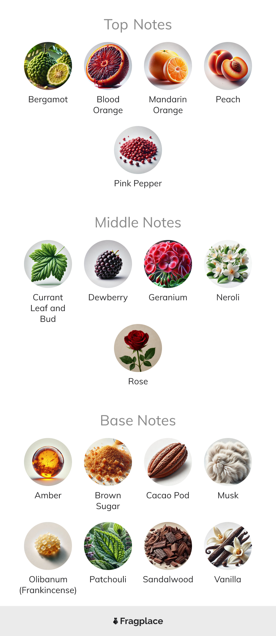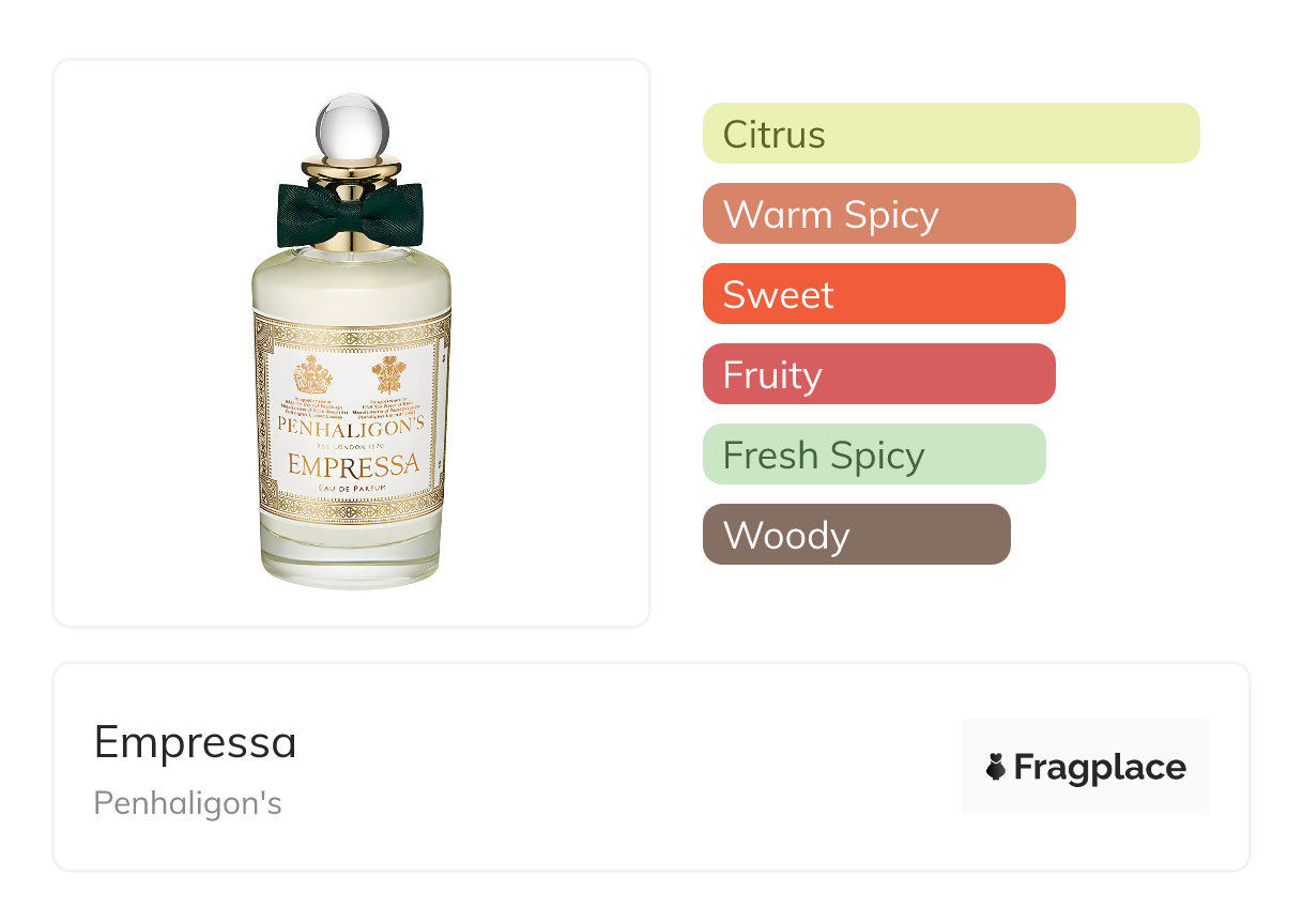 Empressa, from Penhaligon's was released in 2014. The perfumer behind this creation is Christian Provenzano. It has the top notes of Bergamot, Blood Orange, Mandarin Orange, Peach, and Pink Pepper, middle notes of Currant Leaf and Bud, Dewberry, Geranium, Neroli, and Rose, and base notes of Amber, Brown Sugar, Cacao Pod, Musk, Olibanum (Frankincense), Patchouli, Sandalwood, and Vanilla.
