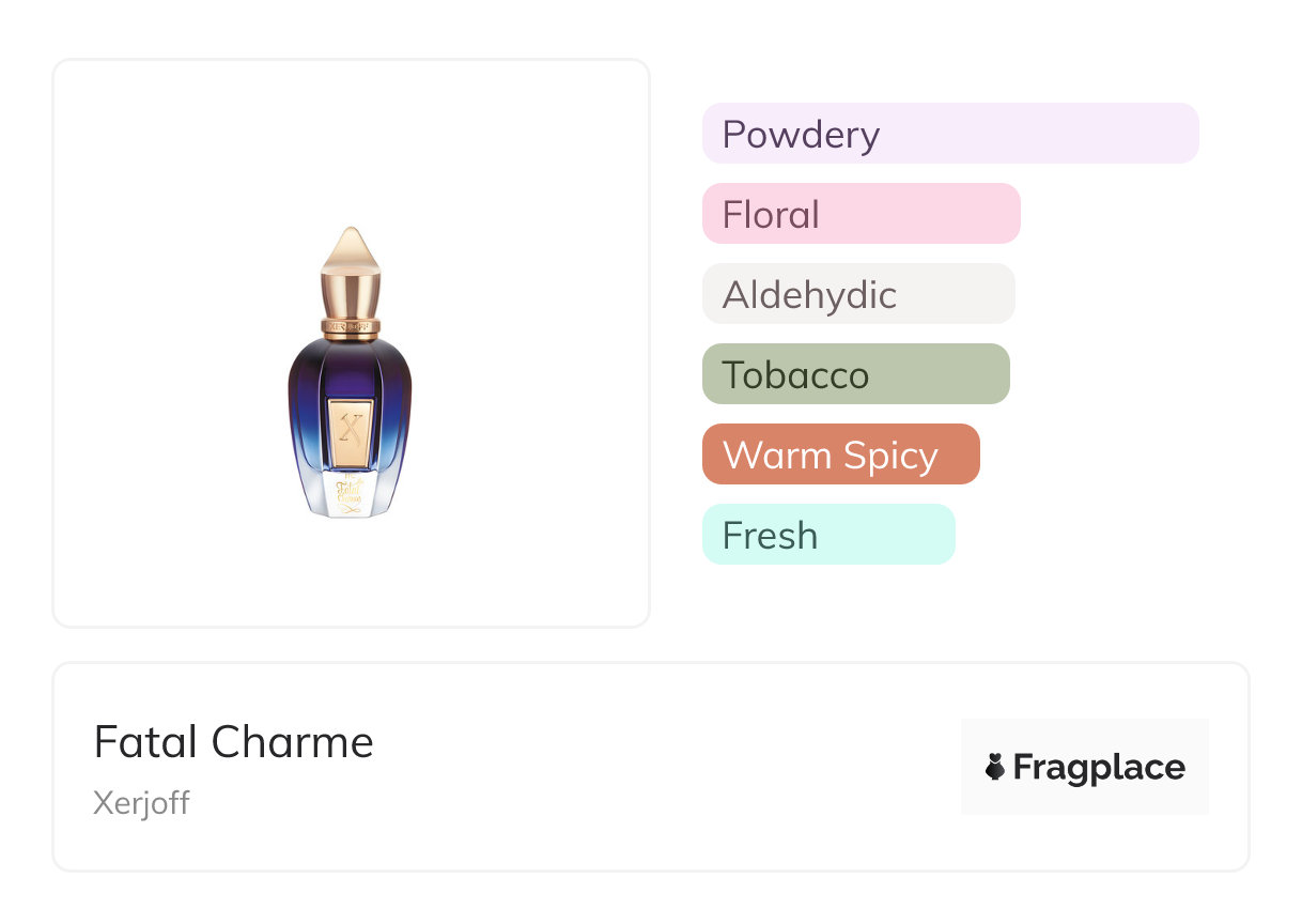 Fatal Charme, from Xerjoff was released in 2012. The perfumer behind this creation is Chris Maurice. The notes are Aldehydes, Ambergris, Floral Notes, Orris Root, Powdery Notes, Spicy Notes, Tobacco.