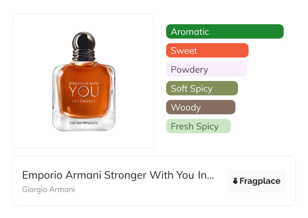 Emporio Armani Stronger With You Intensely, from Giorgio Armani was released in 2019. The perfumer behind this creation is unknown. It has the top notes of Juniper, Pink Pepper, and Violet, middle notes of Cinnamon, Lavender, Sage, and Toffee, and base notes of Amberwood, Suede, and Vanilla.