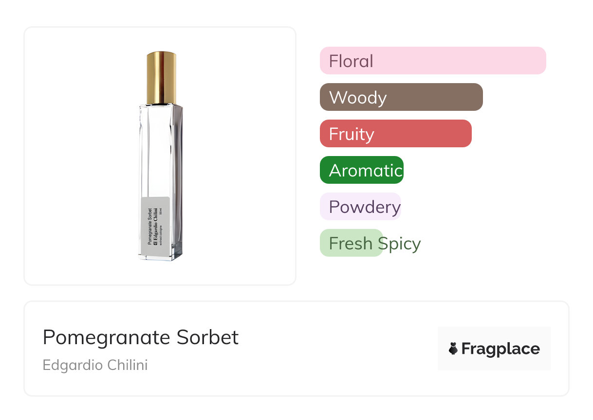 Pomegranate Sorbet, from Edgardio Chilini was released in 2021. The perfumer behind this creation is Sergey Karov. It has the top notes of Avocado, Black Currant, Cranberry, English Marigold, and Pink Pepper, middle notes of Cyclamen, Freesia, Ginger, Lotus, Magnolia, Orchid, Osmanthus, Pomegranate, Rhubarb, and Violet, and base notes of Cashmeran, Cedarwood, Sandalwood, and Vetiver.