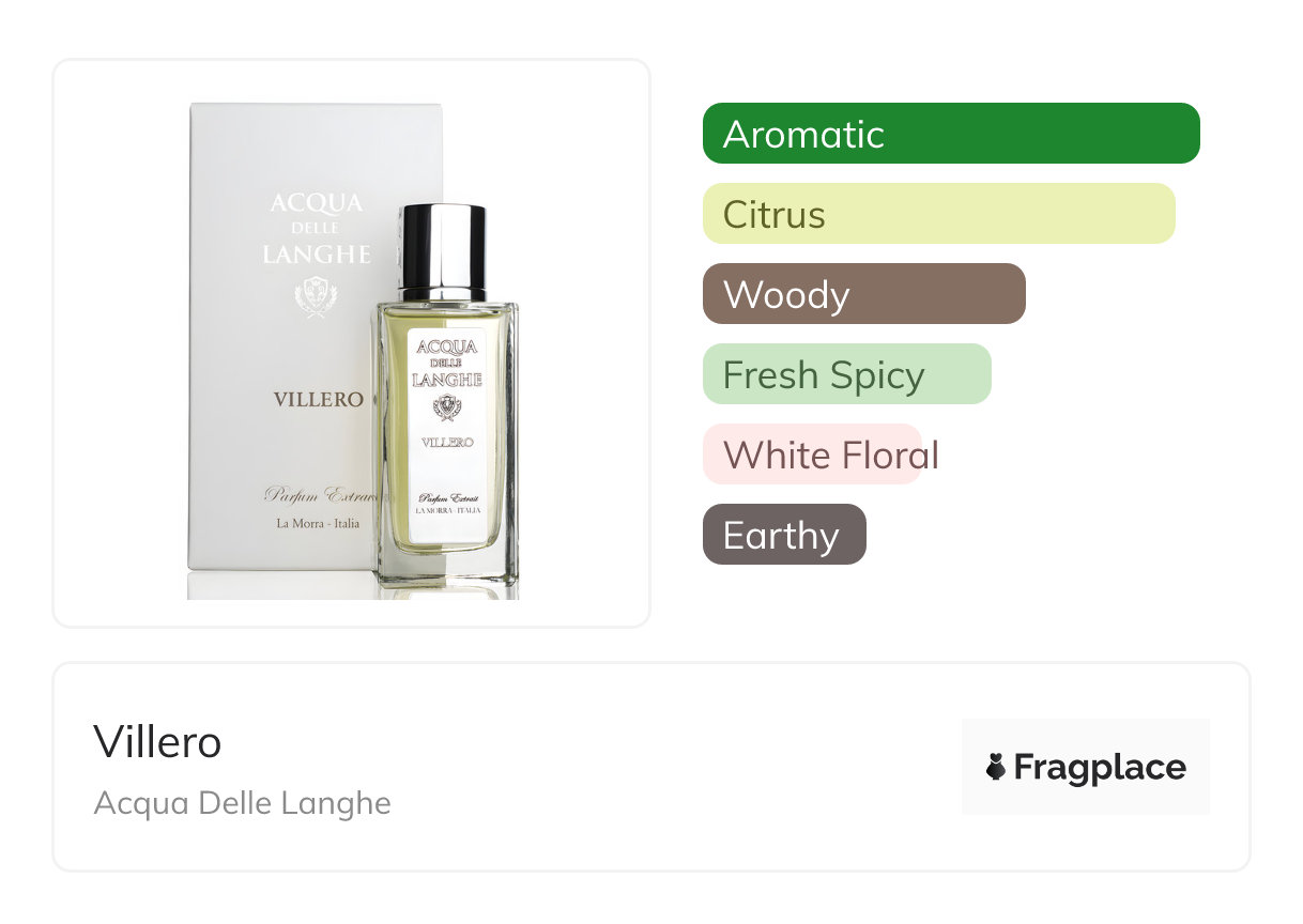Villero, from Acqua Delle Langhe was released in 2012. The perfumer behind this creation is unknown. It has the top notes of Bergamot, Cardamom, Lavender, Lemon, Orange, and Petitgrain, middle notes of Jasmine, Lily-of-the-Valley, Rose, and Rosemary, and base notes of Grapefruit, Musk, Oakmoss, Palisander Rosewood, and Vetiver.