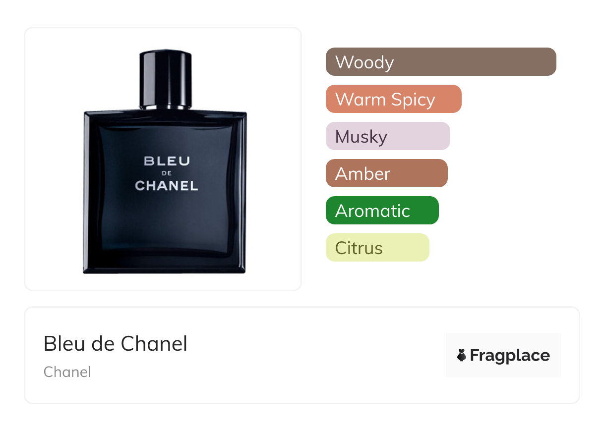 Bleu de Chanel, from Chanel was released in 2010. The perfumer behind this creation is Jacques Polge. It has the top notes of Grapefruit, Lemon, Mint, and Pink Pepper, middle notes of Ginger, Iso E Super, Jasmine, and Nutmeg, and base notes of Cedarwood, Incense, Labdanum, Musk, Patchouli, Sandalwood, and Vetiver.