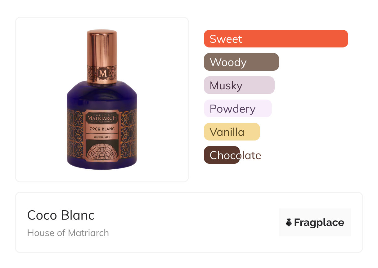 Coco Blanc, from House of Matriarch was released in 2013. The perfumer behind this creation is Christi Meshell. The notes are Masala Chai, Massoia, Musk, Vanilla, White Chocolate, Woody Notes.
