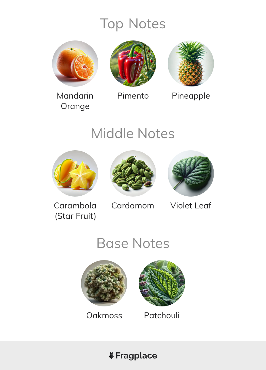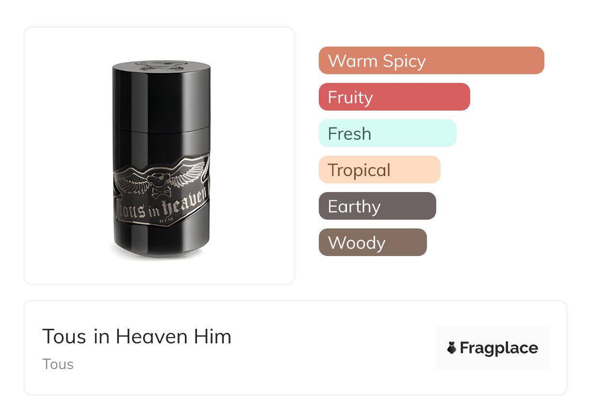 Tous in Heaven Him, from Tous was released in 2008. The perfumer behind this creation is Alienor Massenet. It has the top notes of Mandarin Orange, Pimento, and Pineapple, middle notes of Carambola (Star Fruit), Cardamom, and Violet Leaf, and base notes of Oakmoss and Patchouli.