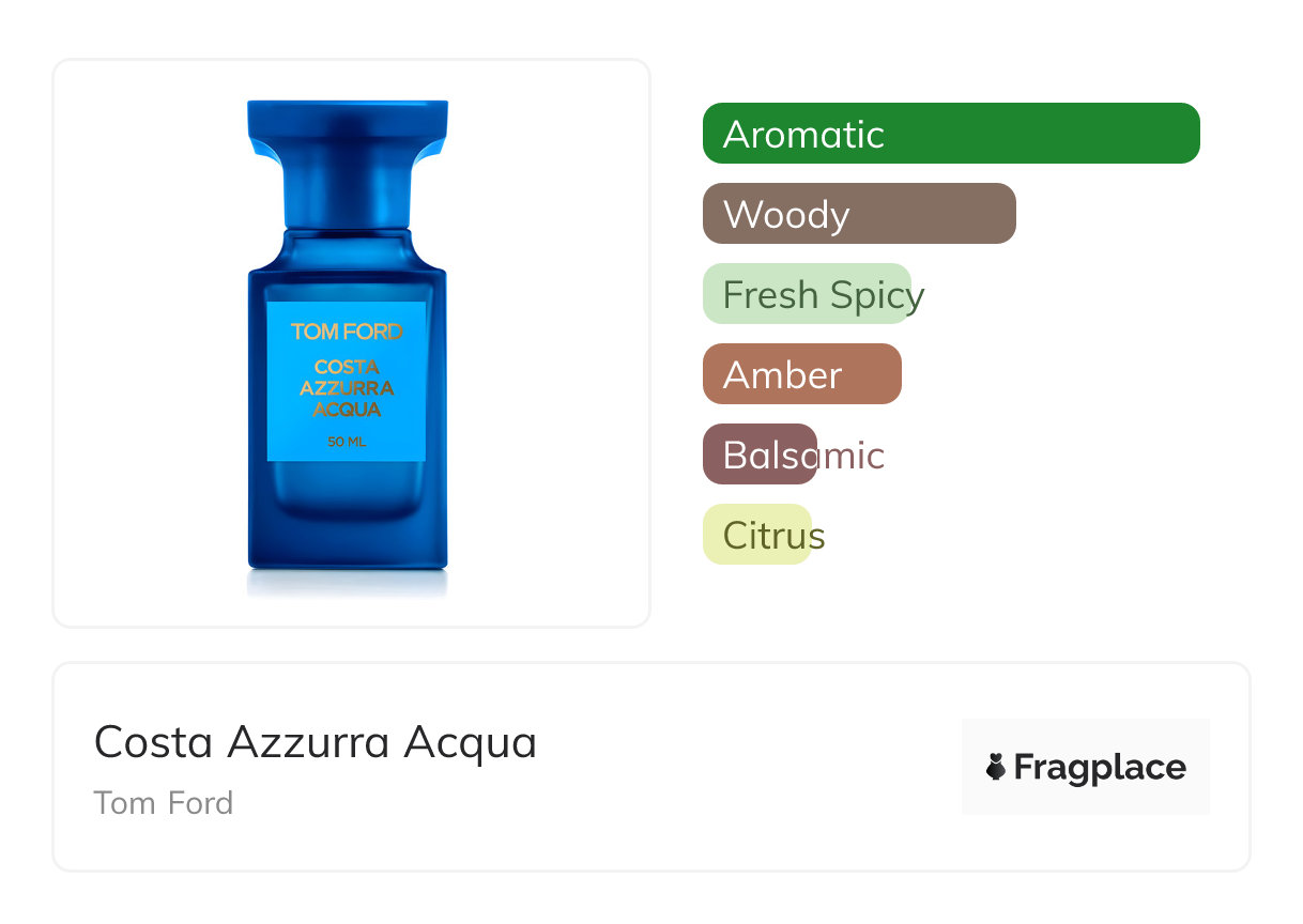 Costa Azzurra Acqua, from Tom Ford was released in 2019. The perfumer behind this creation is unknown. It has the top notes of Juniper Berries, Lemon, and Myrtle, middle notes of Cypress and Pine Tree, and base notes of Amber, Labdanum, and Mastic or Lentisque.