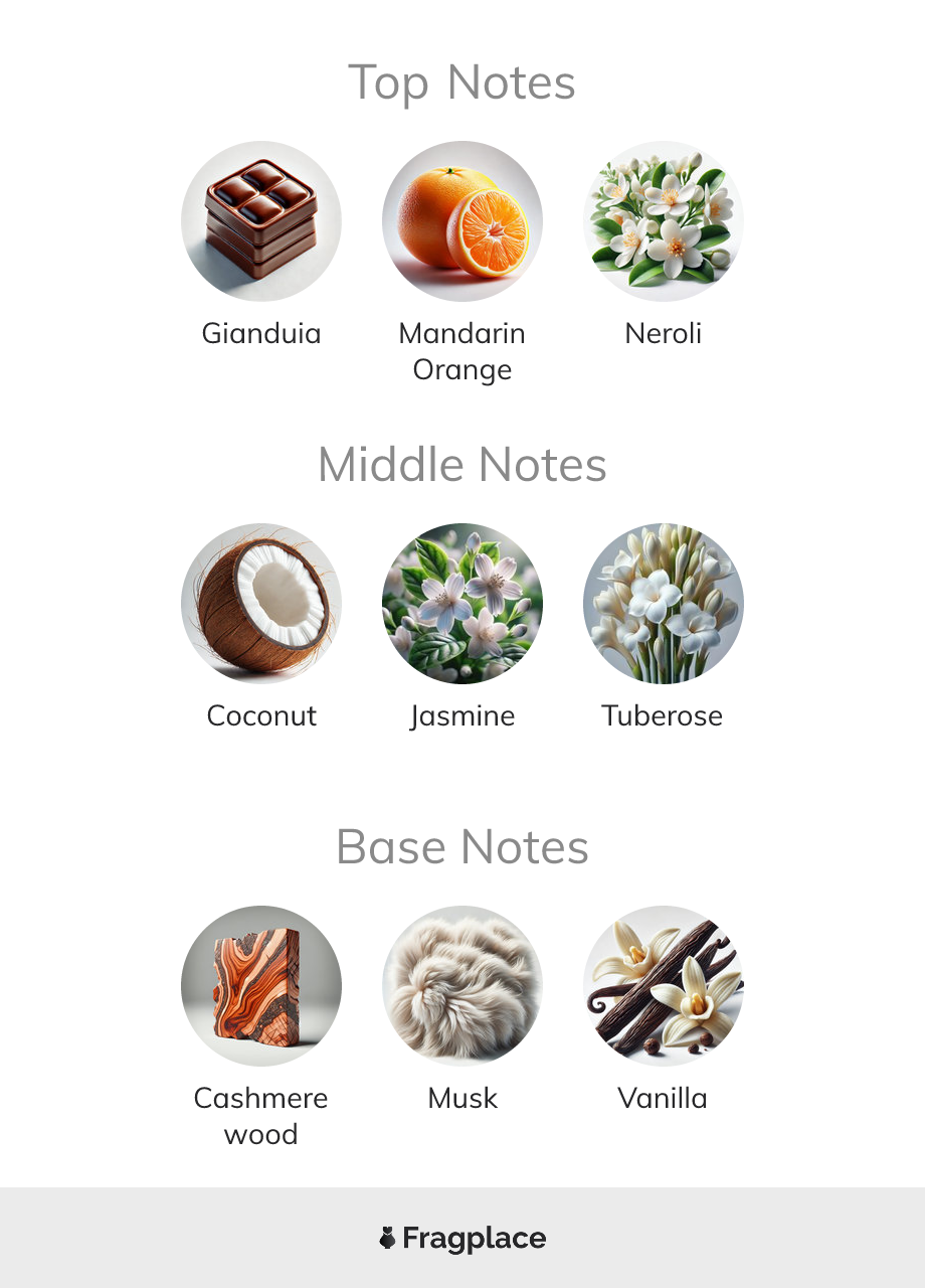 Ermanno Scervino Eau de Parfum, from Ermanno Scervino was released in 2019. The perfumer behind this creation is Julie Massé, Mathilde Bijaoui, and Véronique Nyberg. It has the top notes of Gianduia, Mandarin Orange, and Neroli, middle notes of Coconut, Jasmine, and Tuberose, and base notes of Cashmere wood, Musk, and Vanilla.