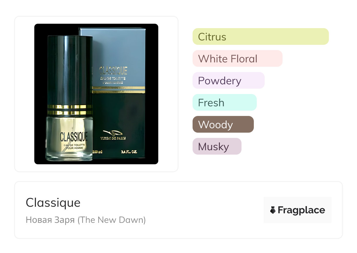 Classique, from Новая Заря (The New Dawn) was released at unknown year. The perfumer behind this creation is unknown. It has the top notes of Cardamom, Lily-of-the-Valley, and Mandarin Orange, middle notes of Iris, Neroli, and Orange, and base notes of Amber, Cedarwood, and Musk.