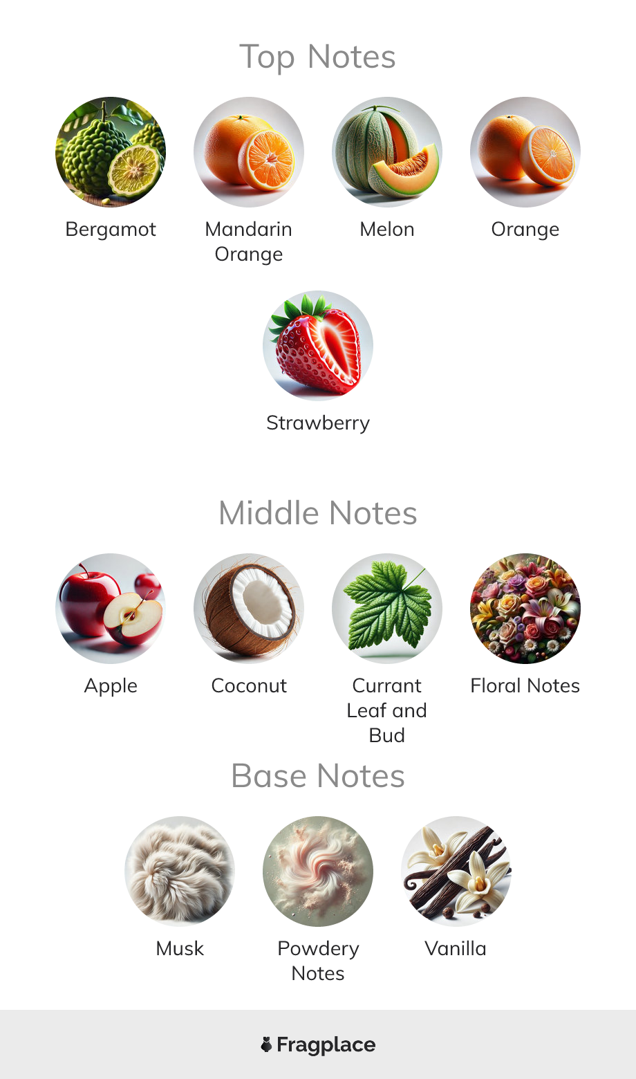 Chantilly, from Gritti was released in 2018. The perfumer behind this creation is Luca Gritti. It has the top notes of Bergamot, Mandarin Orange, Melon, Orange, and Strawberry, middle notes of Apple, Coconut, Currant Leaf and Bud, and Floral Notes, and base notes of Musk, Powdery Notes, and Vanilla.