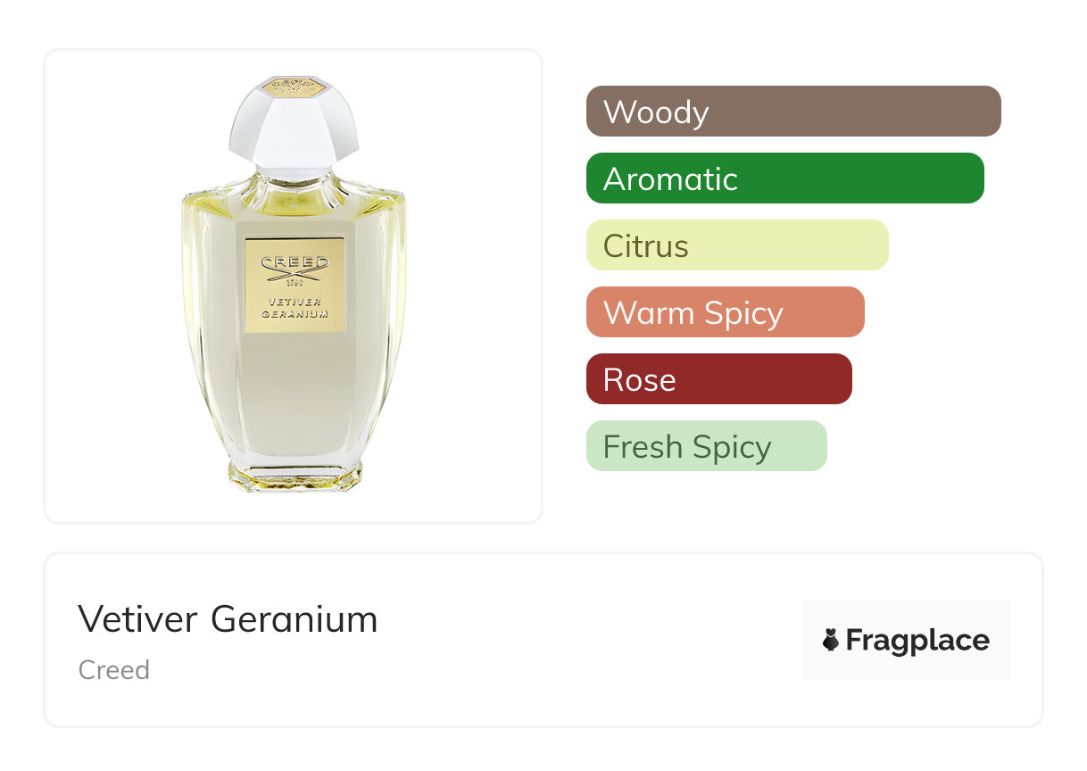 Vetiver Geranium, from Creed was released in 2014. The perfumer behind this creation is Julien Rasquinet. It has the top notes of Apple, Bergamot, and Lemon, middle notes of Cinnamon, Geranium, and Rose, and base notes of Amber, Cedarwood, Musk, Patchouli, and Vetiver.