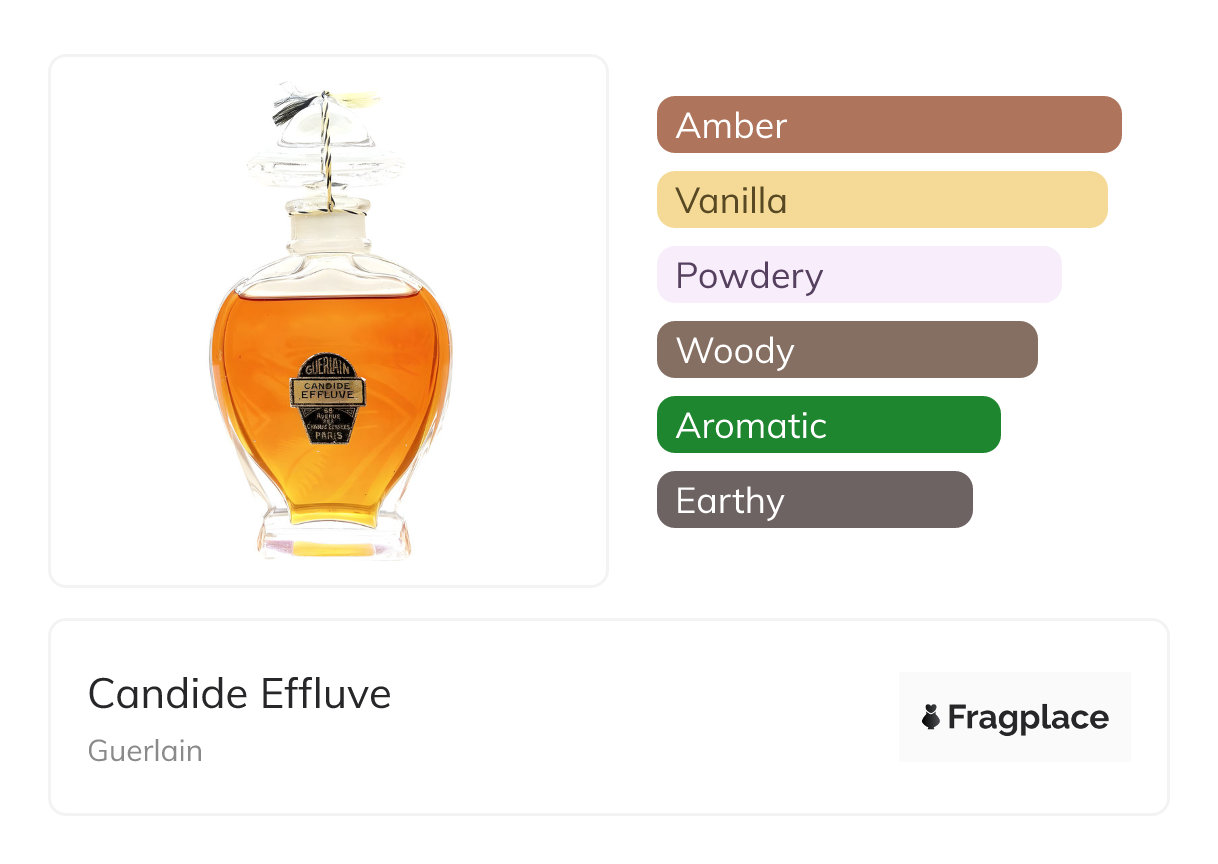 Candide Effluve, from Guerlain was released in 1922. The perfumer behind this creation is Jacques Guerlain. The notes are Amber, Angelica, Benzoin, Bergamot, Heliotrope, Jasmine, Lemon, Lilac, Orris Root, Patchouli, Tonka Bean, Vanilla, Vetiver, Ylang-Ylang.