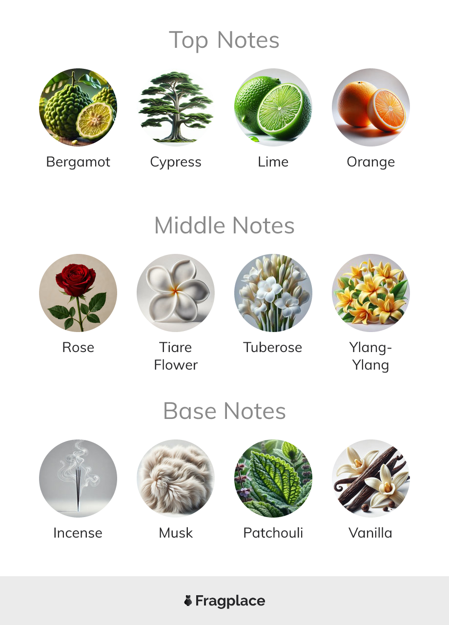 Mahab, from The Scent Library was released in 2023. The perfumer behind this creation is Saeed AlNuaimi. It has the top notes of Bergamot, Cypress, Lime, and Orange, middle notes of Rose, Tiare Flower, Tuberose, and Ylang-Ylang, and base notes of Incense, Musk, Patchouli, and Vanilla.