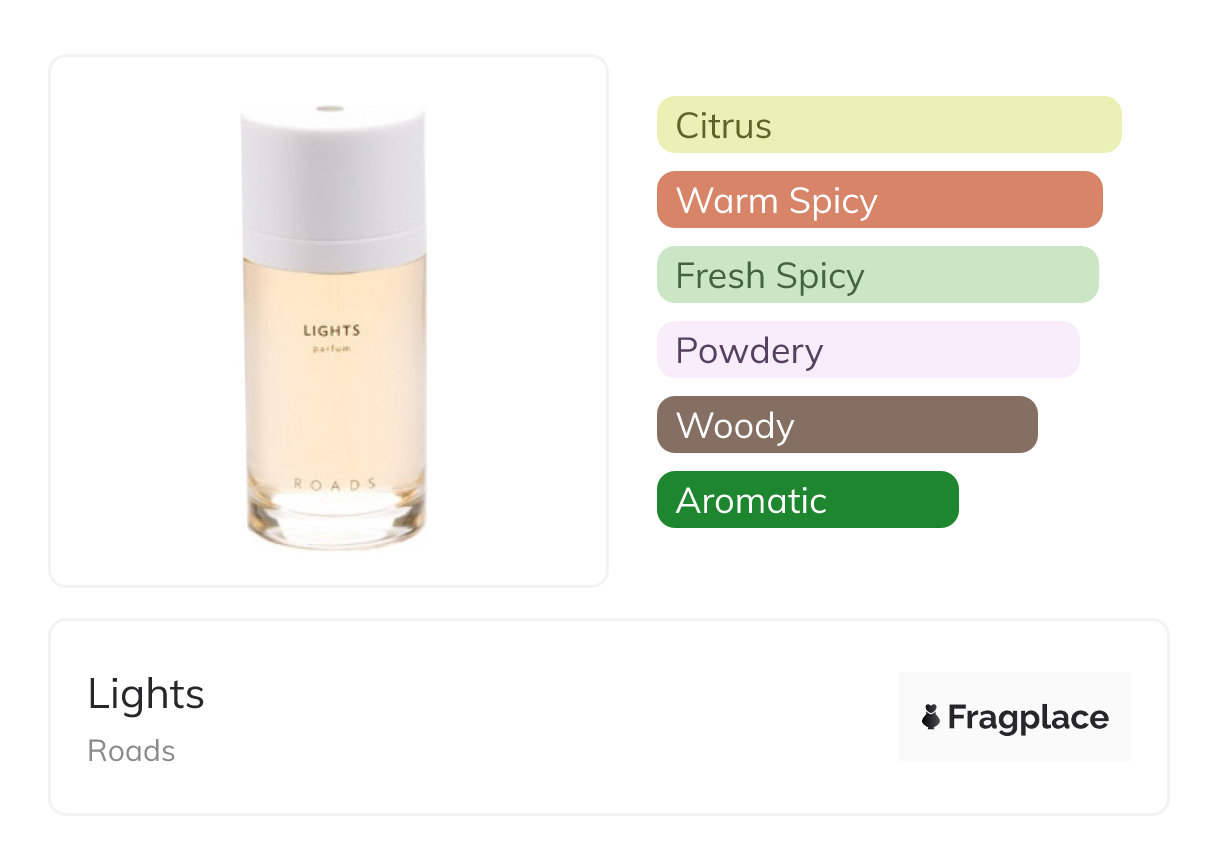 Lights, from Roads was released in 2014. The perfumer behind this creation is unknown. It has the top notes of Bergamot, Citruses, Jasmine, and Ylang-Ylang, middle notes of Cloves, Geranium, and Violet Leaf, and base notes of Amber, Musk, Sandalwood, and Vanilla.