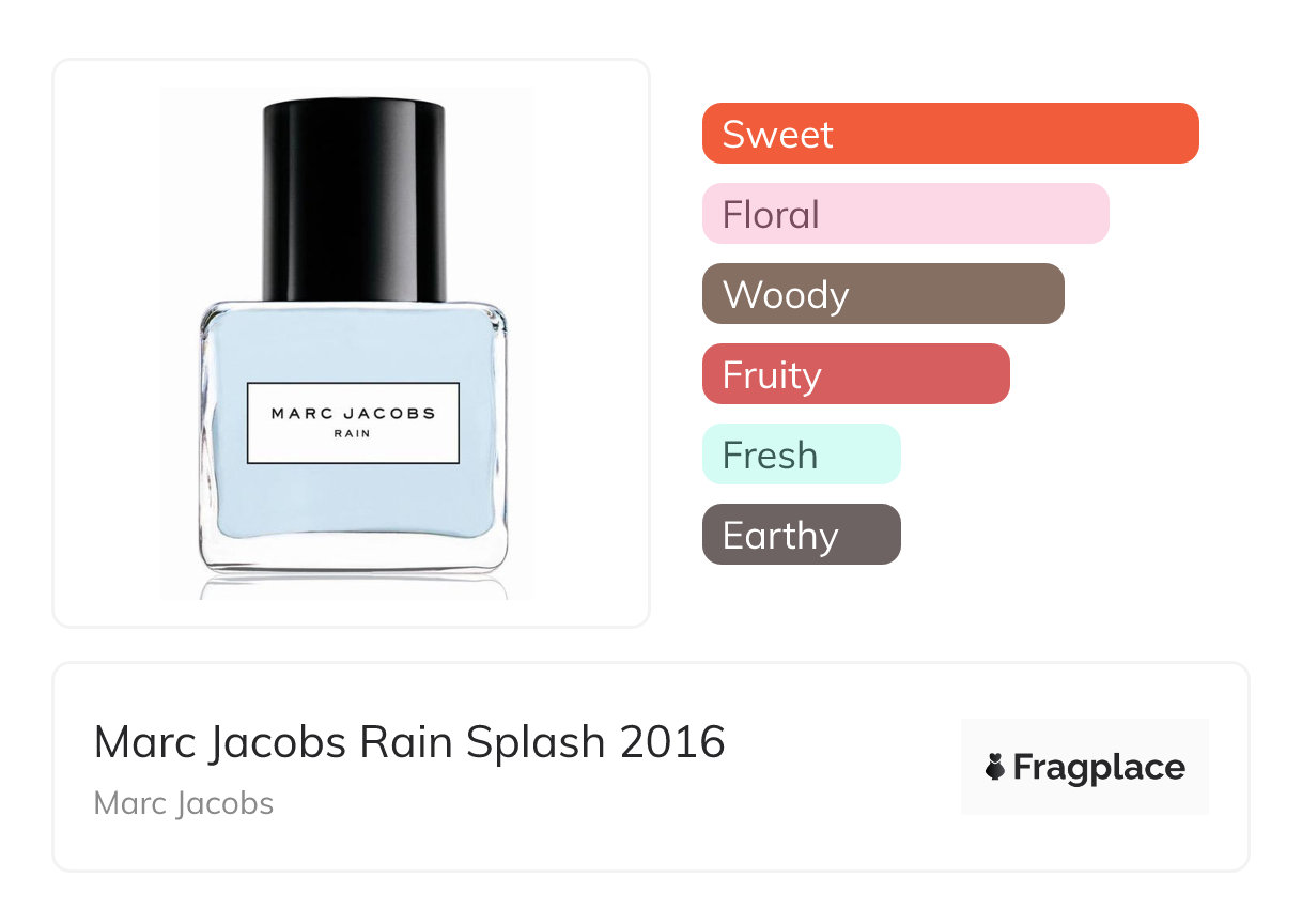 Marc Jacobs Rain Splash 2016, from Marc Jacobs was released in 2016. The perfumer behind this creation is Laurent Le Guernec. It has the top notes of Clementine, Cypress, Grass, and Wild Strawberry, middle notes of Orchid, Passion Flower, Sunflower, and Water, and base notes of Amber, Musk, Oakmoss, and Teak Wood.