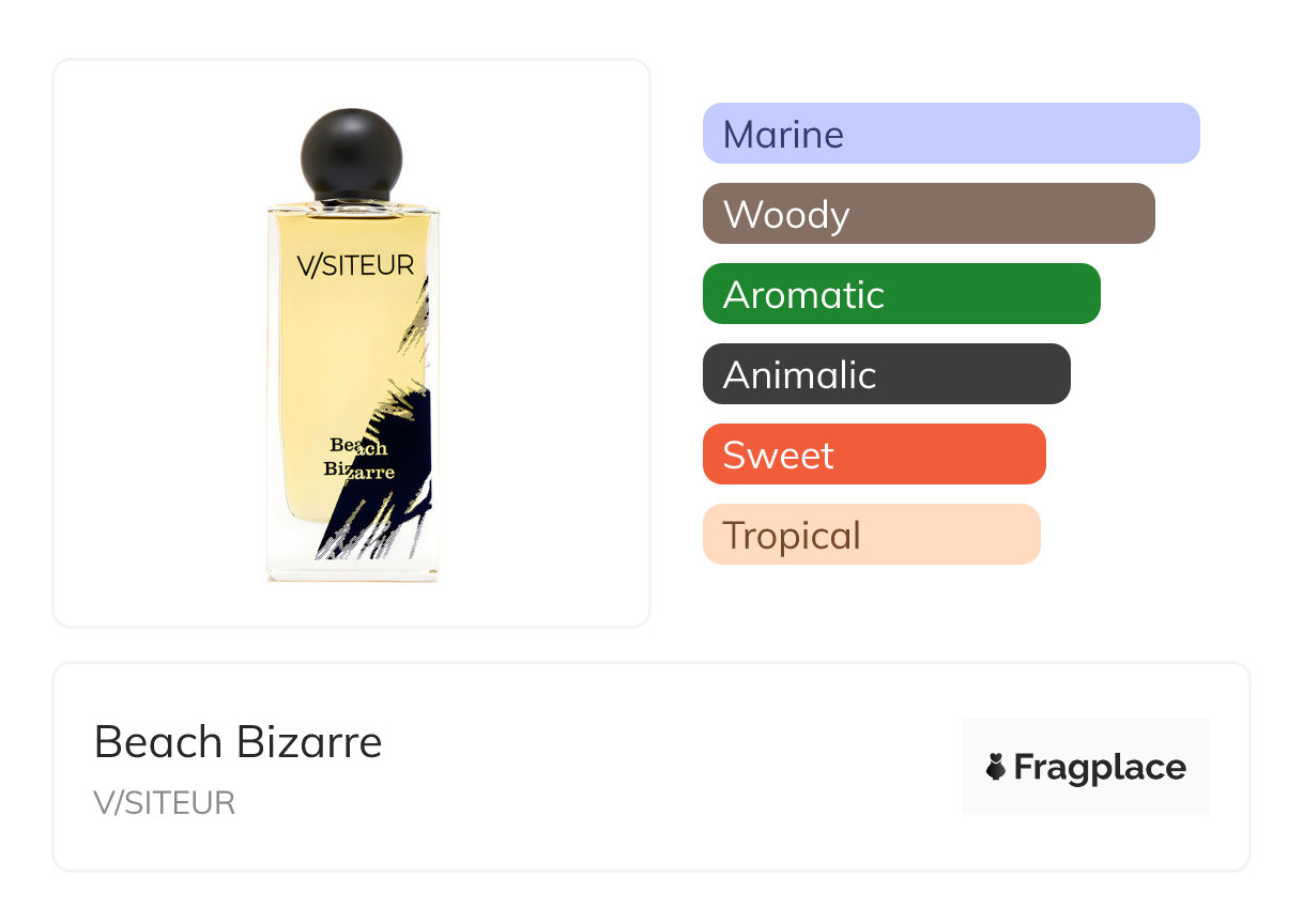 Beach Bizarre, from V/SITEUR was released in 2020. The perfumer behind this creation is Patrice Revillard. The notes are Ambergris, Cannabis, Cumin, Gardenia, Lime, Patchouli, Salt, Seaweed, Tropical Fruits, Ylang-Ylang.
