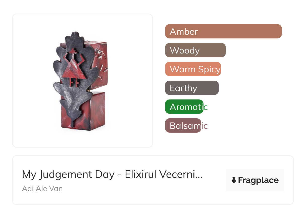 My Judgement Day - Elixirul Vecerniei, from Adi Ale Van was released in 2023. The perfumer behind this creation is Jimmy Bodin. It has the top notes of Benzoin, Lavender, and Olibanum (Frankincense), middle notes of Benzoin, Cistus Incanus, and Olibanum (Frankincense), and base notes of Cypriol Oil or Nagarmotha, Labdanum, Myrrh, Oakmoss, and Vetiver.