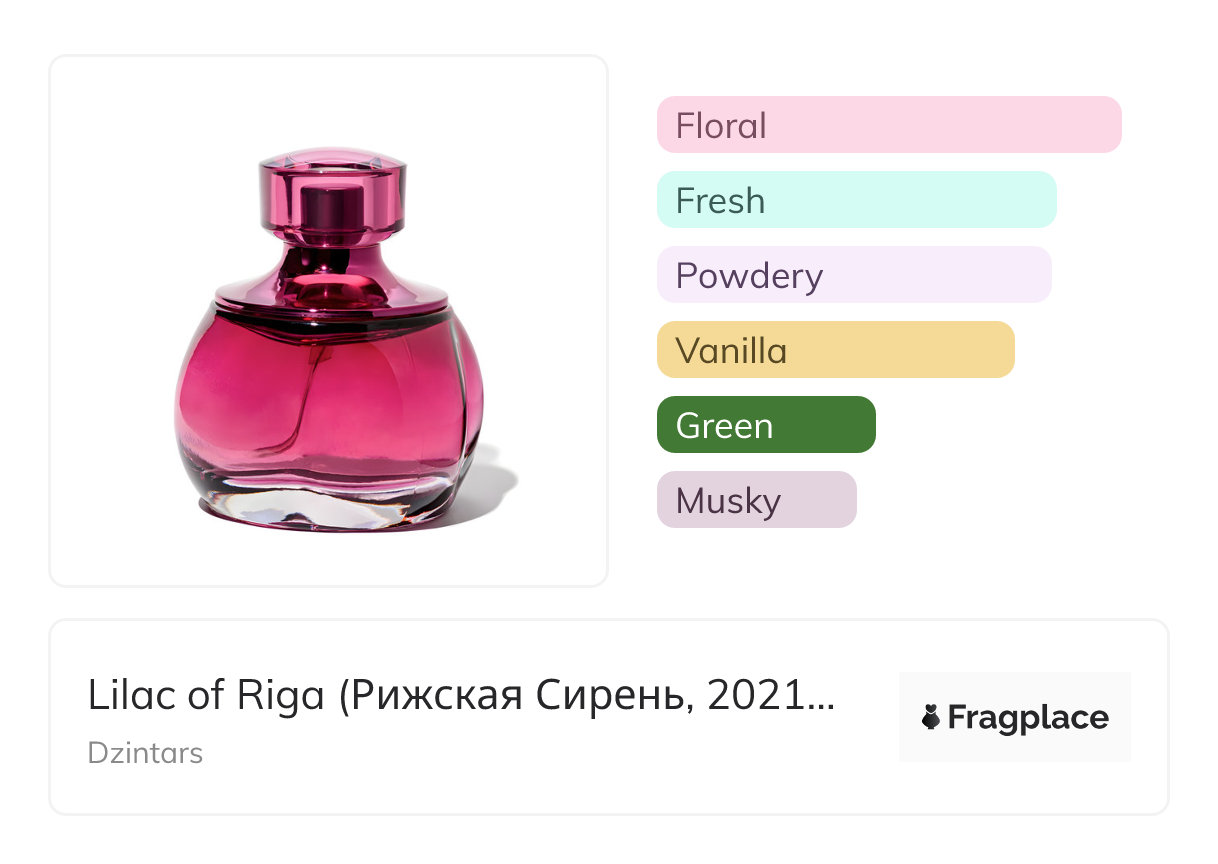 Lilac of Riga (Рижская Сирень, 2021), from Dzintars was released in 2021. The perfumer behind this creation is unknown. It has the top notes of Cyclamen, Lilac, and Lily-of-the-Valley, middle notes of Cinnamon, Heliotrope, and Vanilla, and base notes of Amber and Musk.