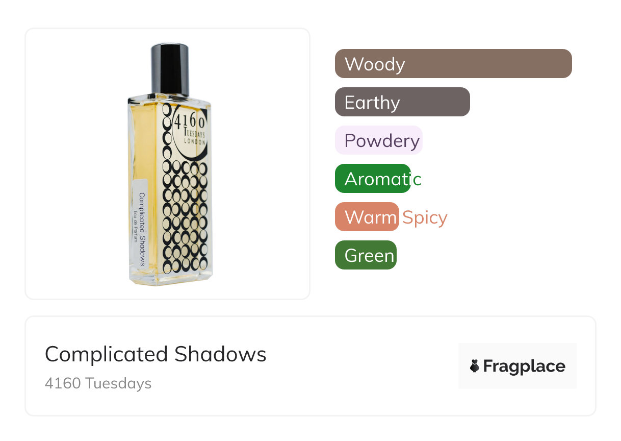 Complicated Shadows from 4160 Tuesdays is a perfume for the insomniac hours, late-night strolls wandering through the deserted streets of your hometown, familiar landmarks strangely distorted by the play of moonlight and shadow. The warm, velvety sandalwood whispers in contrast to the chilling "shade" note, evoking the breathless hush of liminal, in-between spaces. The iris and narcissus here are shrouded in mystery, their earthy floral murmurations laced with a tang of acrid irony, simmering existential angst below the surface of introspective ponderings. Veiled in a bitter vanilla mist, it's the uncanny reverie, nocturnal glooms, and haunting landscapes of the dreamless, lost in the dark.