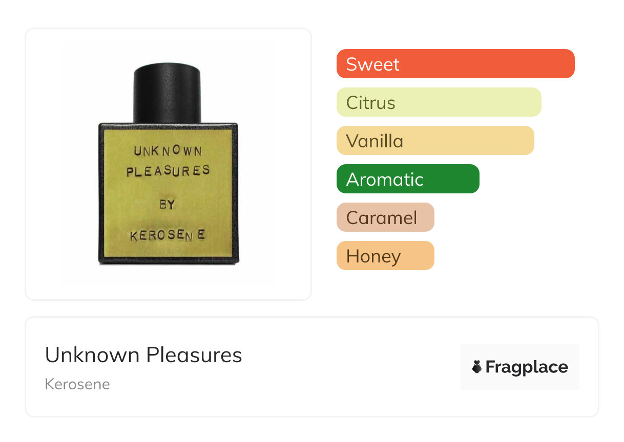 Unknown Pleasures, from Kerosene was released in 2013. The perfumer behind this creation is John Pegg. The notes are Bergamot, Caramel, Honey, Lemon, Tea, Tonka Bean, Vanilla.