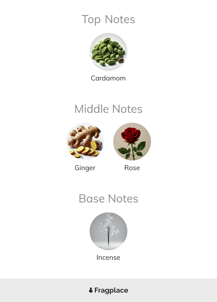 Spicy, leathery gingerbread at the outset that swiftly turns into a very potent dark rose. This gradually diminishes, turns slighty medicinal in the drydown, then there's a soft, pleasant incense to round it off.