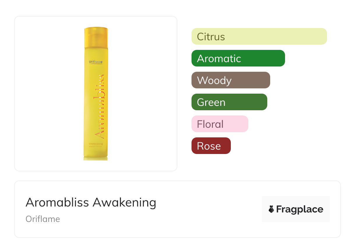 Aromabliss Awakening, from Oriflame was released in 2000. The perfumer behind this creation is Emilie Bevierre-Coppermann. It has the top notes of Bergamot, Black Currant, Cardamom, Lemon, Orange, and Tea, middle notes of Green Notes, Jasmine, Magnolia, and Rose Hip, and base notes of Amyris, Musk, and Woody Notes.