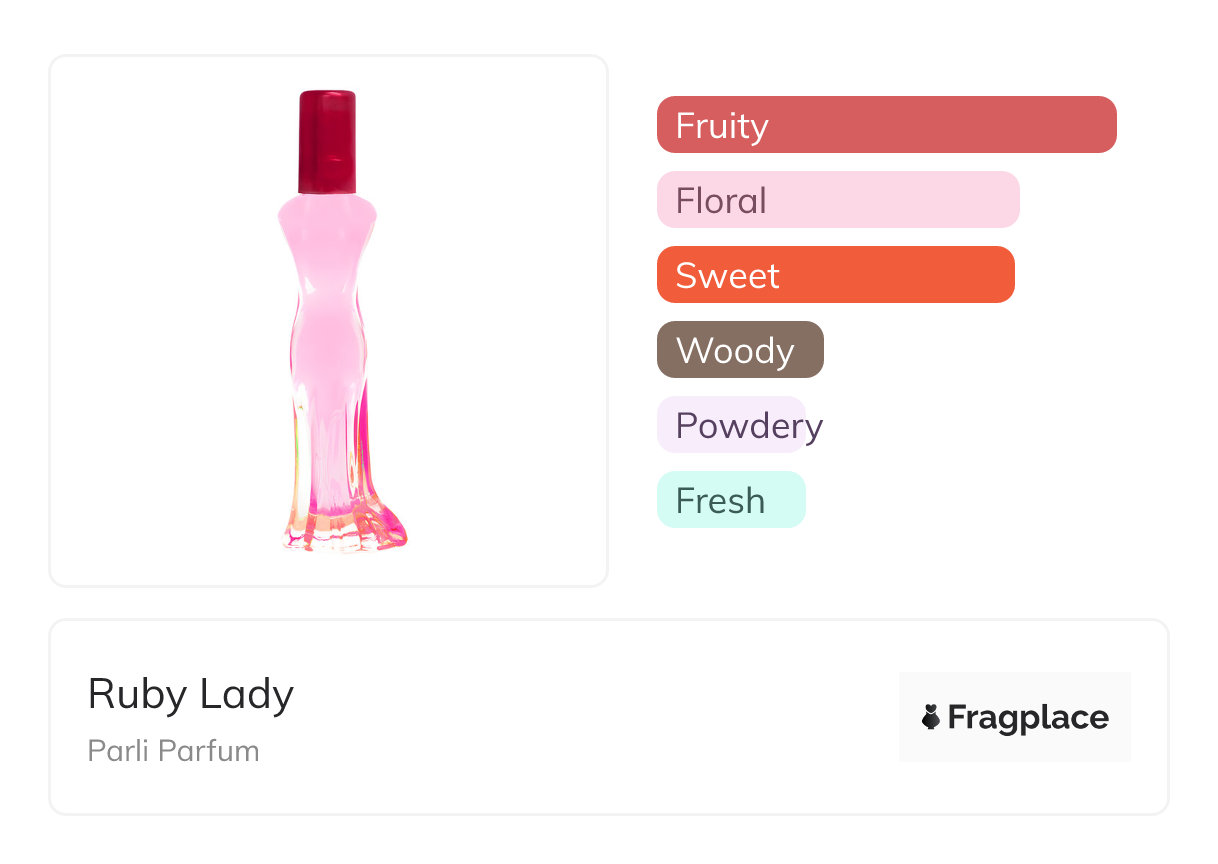 Ruby Lady, from Parli Parfum was released in 2017. The perfumer behind this creation is unknown. It has the top notes of Black Currant, Citruses, Red Apple, and Strawberry, middle notes of Freesia, Jasmine, Rose, and Sweet Pea, and base notes of Amber, Musk, Raspberry, and Sandalwood.