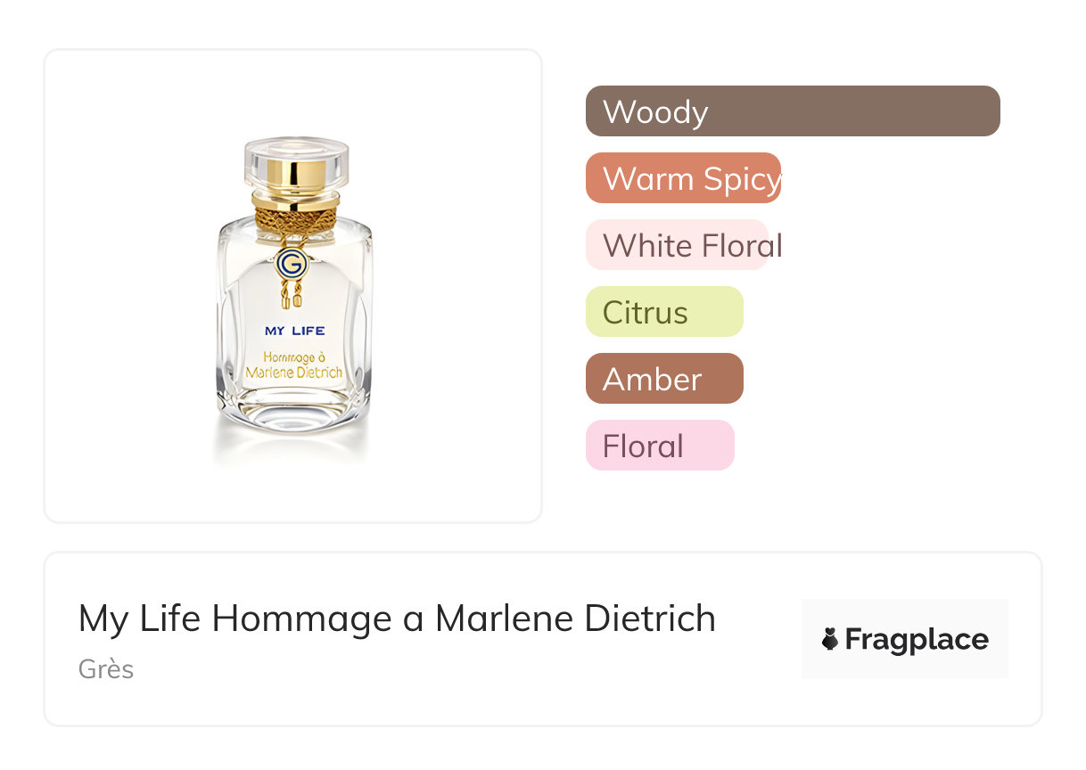 My Life Hommage a Marlene Dietrich, from Grès was released in 2007. The perfumer behind this creation is Marie Salamagne. It has the top notes of Grapefruit, Orange Blossom, Rum, and Wisteria, middle notes of Cedarwood, Heliotrope, and Jasmine, and base notes of Benzoin, Labdanum, Patchouli, Sandalwood, and Vetiver.