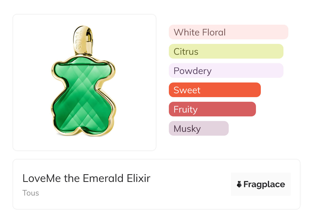 LoveMe the Emerald Elixir, from Tous was released in 2023. The perfumer behind this creation is Dominique Ropion. It has the top notes of Grapefruit, Orange, and Pear, middle notes of Honeysuckle, Jasmine, and Violet, and base notes of Musk, Patchouli, and Vanilla.